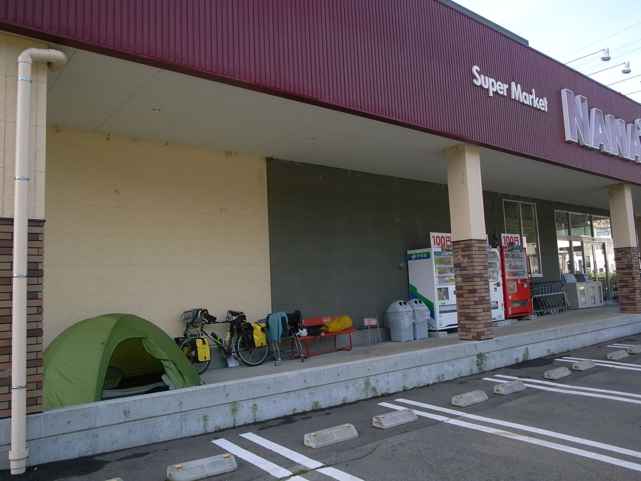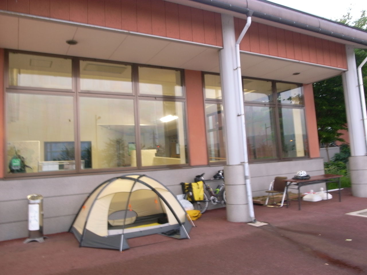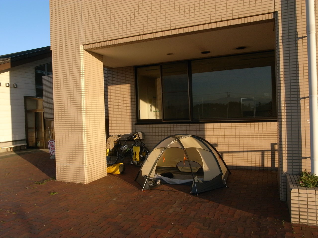 なんだかイベント盛りだくさんの1日を終えて、温泉の軒下に野宿するのは2人の日本1周チャリダーである。