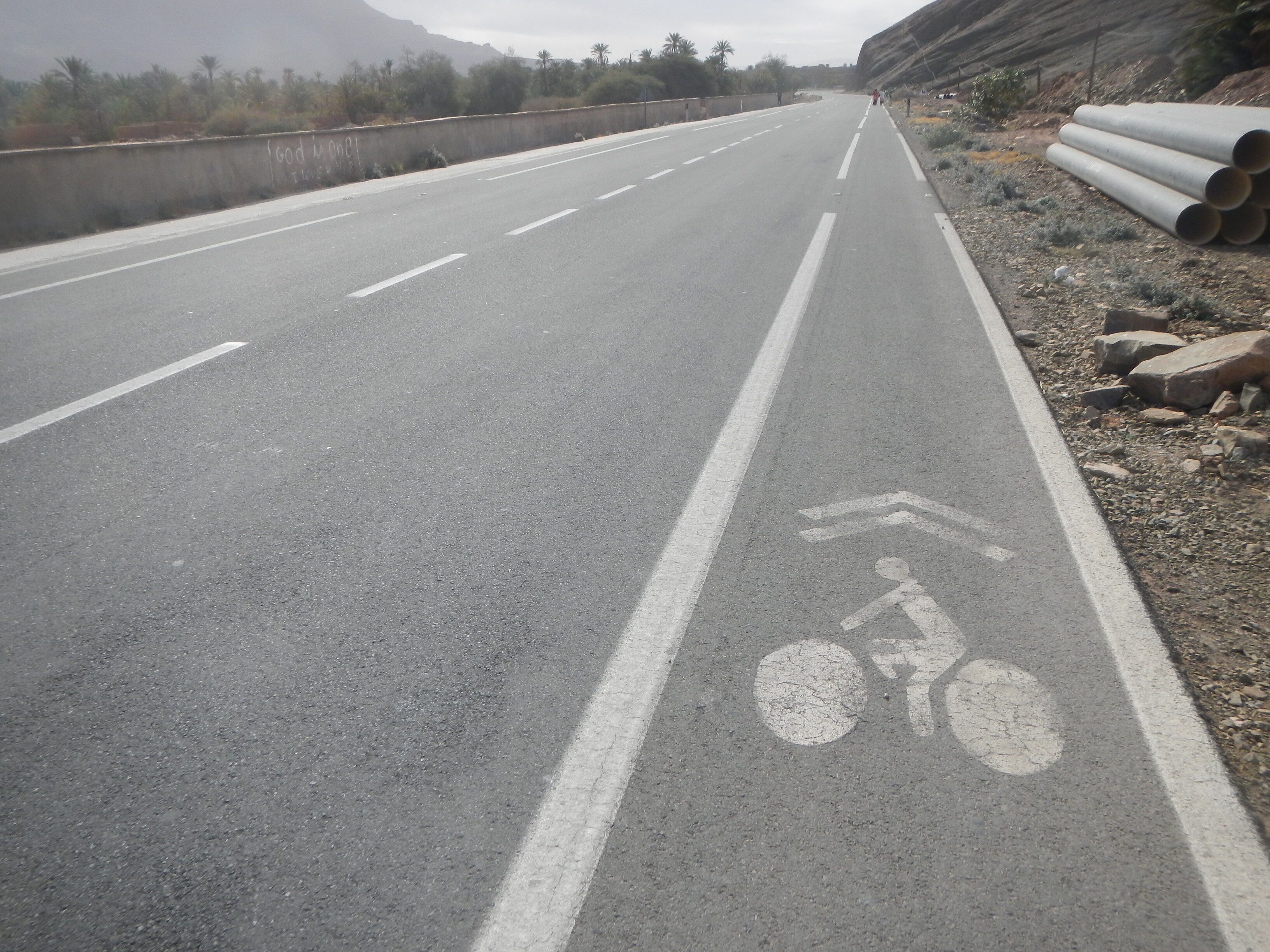 なんかこの自転車レーンの模様フランスかどっかで見た気がするが、どの国だったか思い出せん。恐らくODAとかそうした支援でヨーロッパの国が造った道路のため、ここだけ自転車道完備の道路が続くことになったと想像するがどうなのか?結果としてザゴラまでこのレーンは続いてくれてありがたかった。