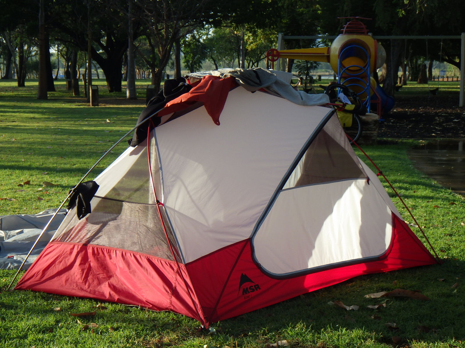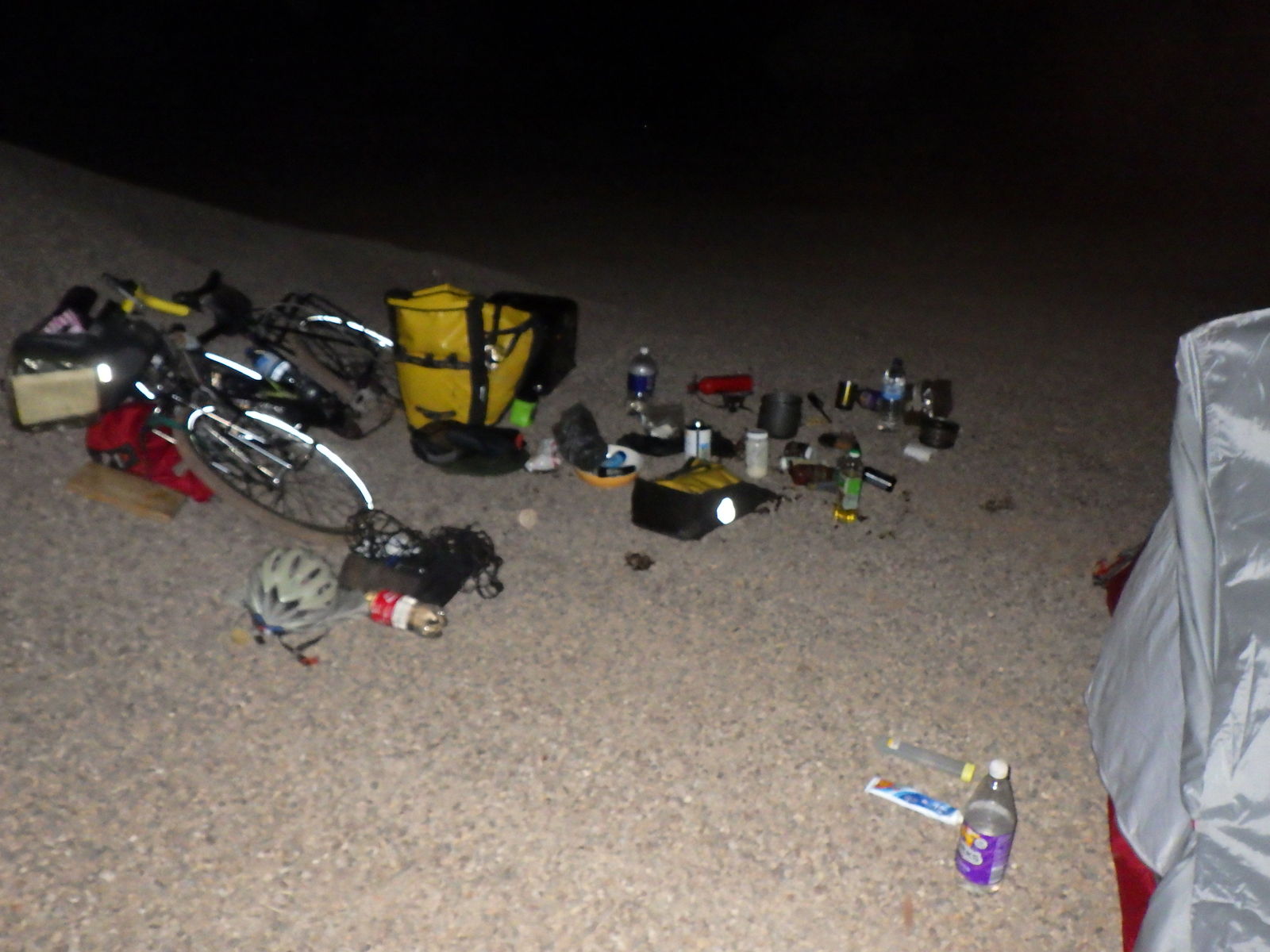 どばばばはーっ・・・という起き抜けから謎の襲撃である。どうやら外のスプリンクラーが動き出してテントに水が当たっているらしい。って、そんな場合じゃねぇ!はやく荷物を避難させなくては。