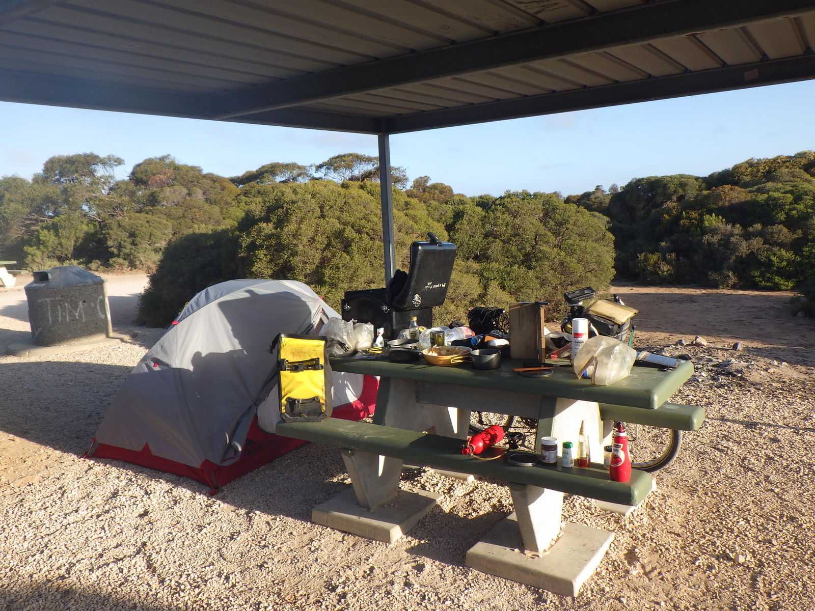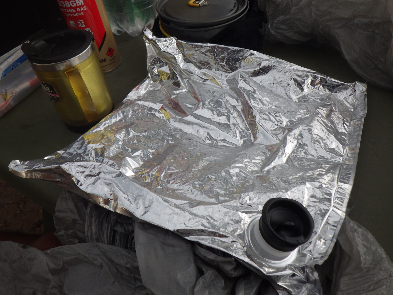 そんな記念日に起きてテントから這い出てみれば、私のバッグというバッグ全てに蟻が満載の地獄絵図とはこれ如何に?どうやら昨日テント設営した場所は、蟻の巣の直近エリアだったようで夜中の間にもの凄い数の蟻が私の荷物に散乱してしまったらしい。軽く見ても千匹はいるぞチクショウ。