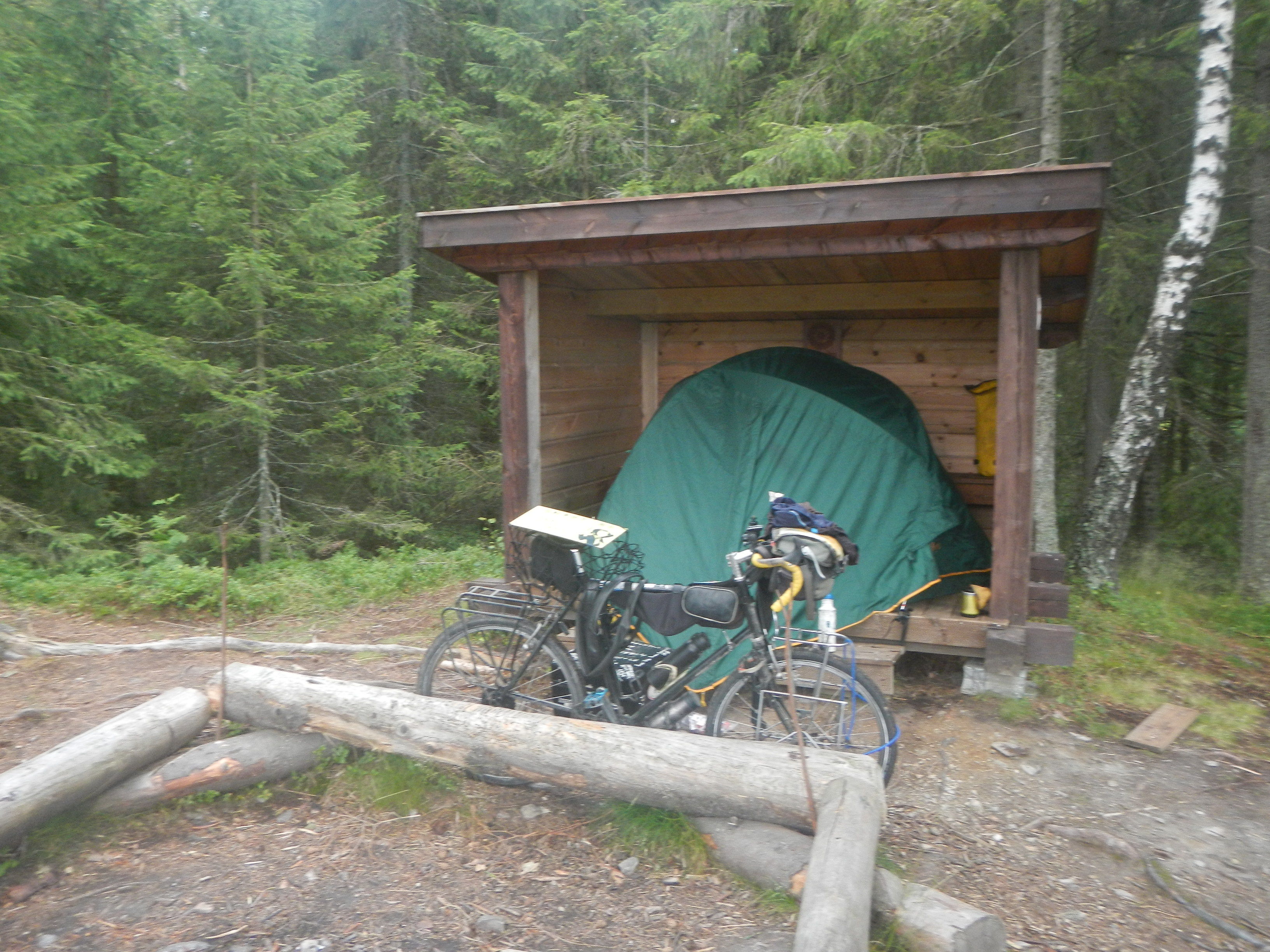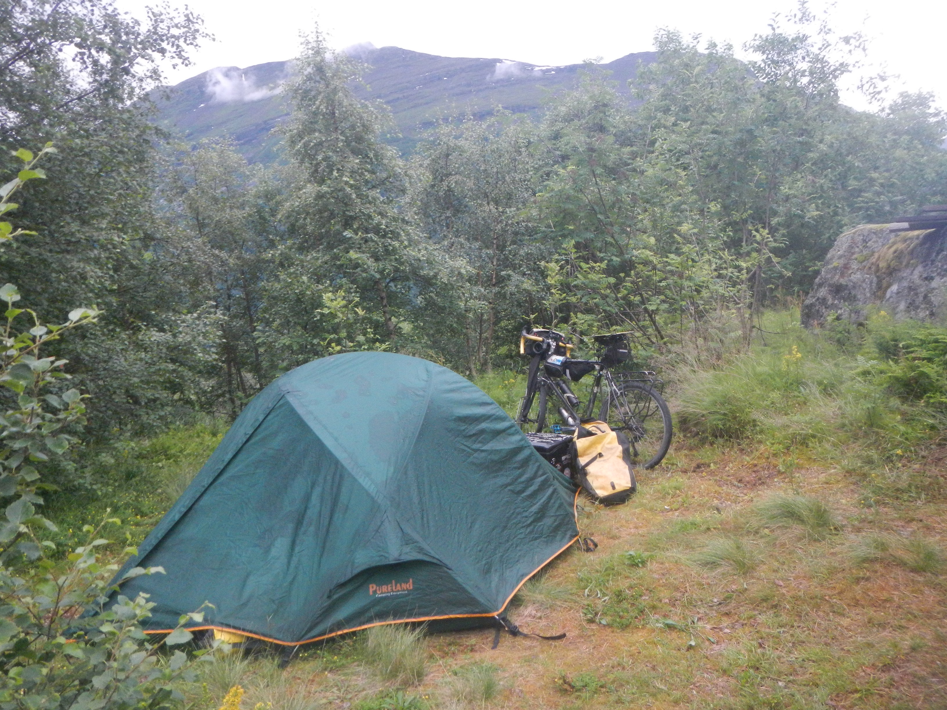 大汗掻きながら何とか峠の頂上付近に森へと入る脇道を見つけ、その道から更に奥まった場所へテント設営して本日終了としたのだが。