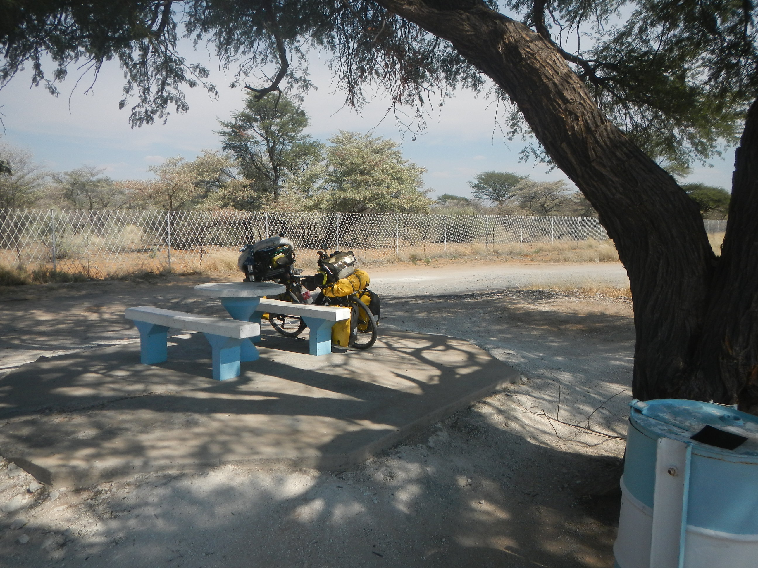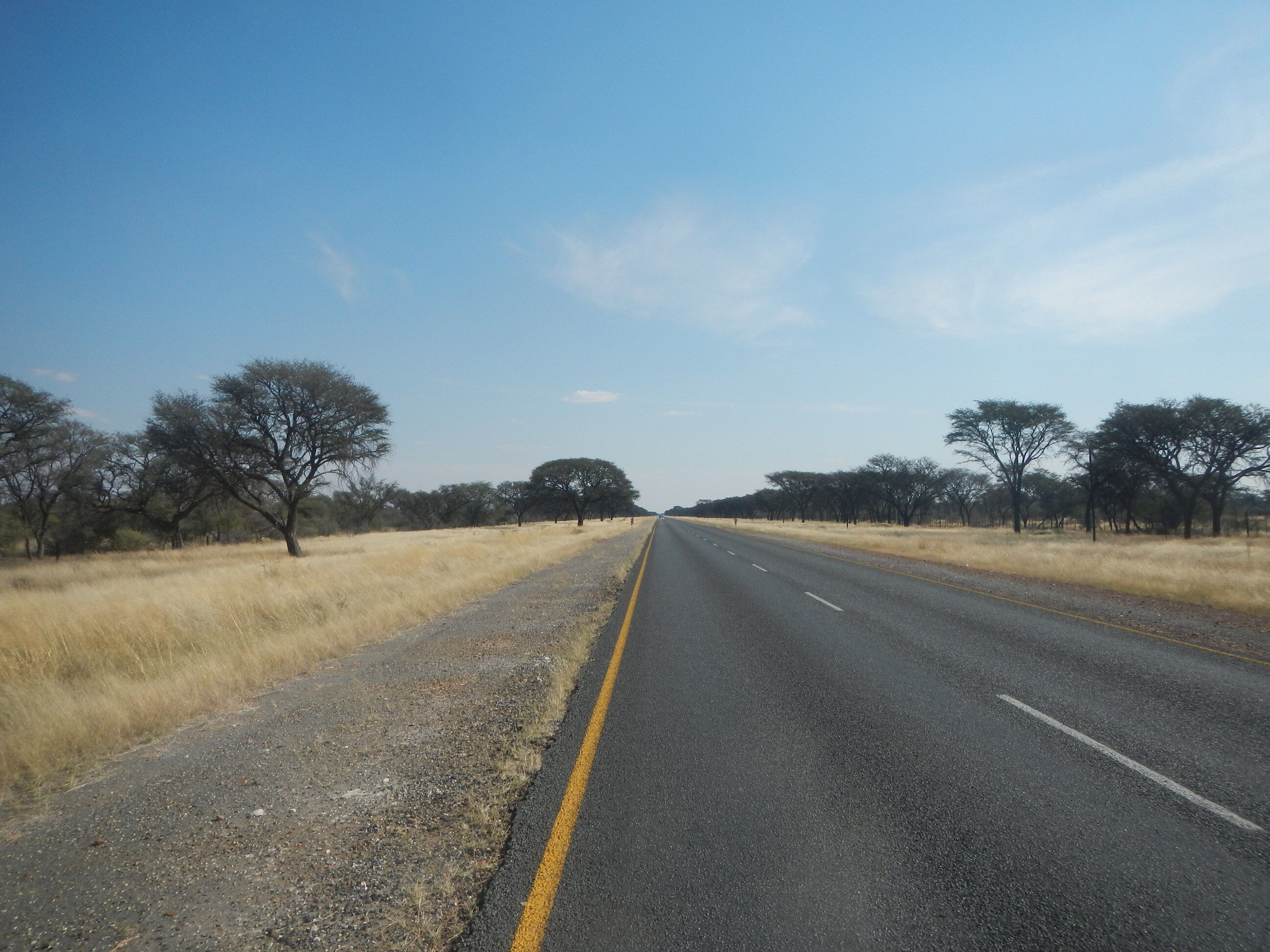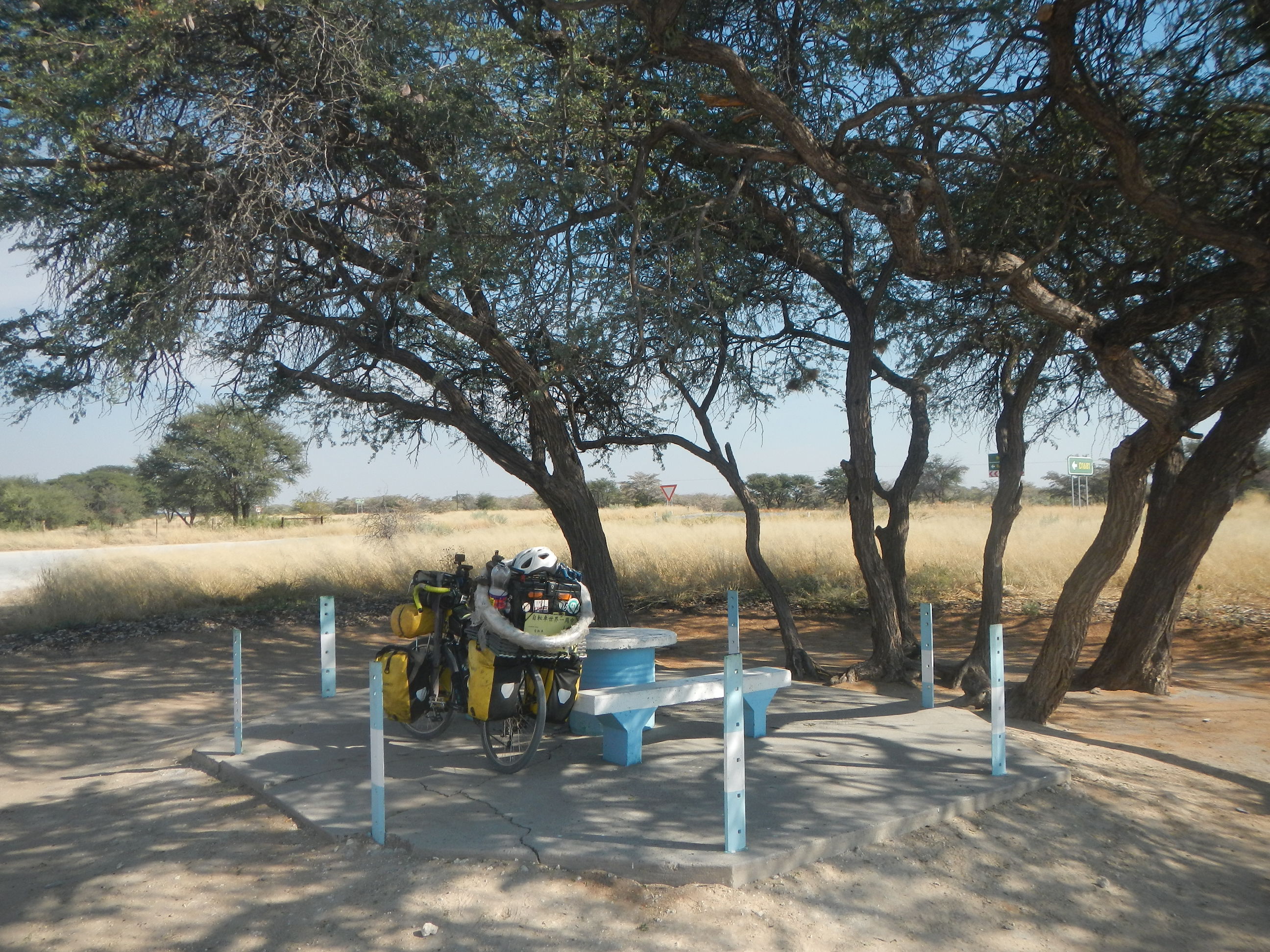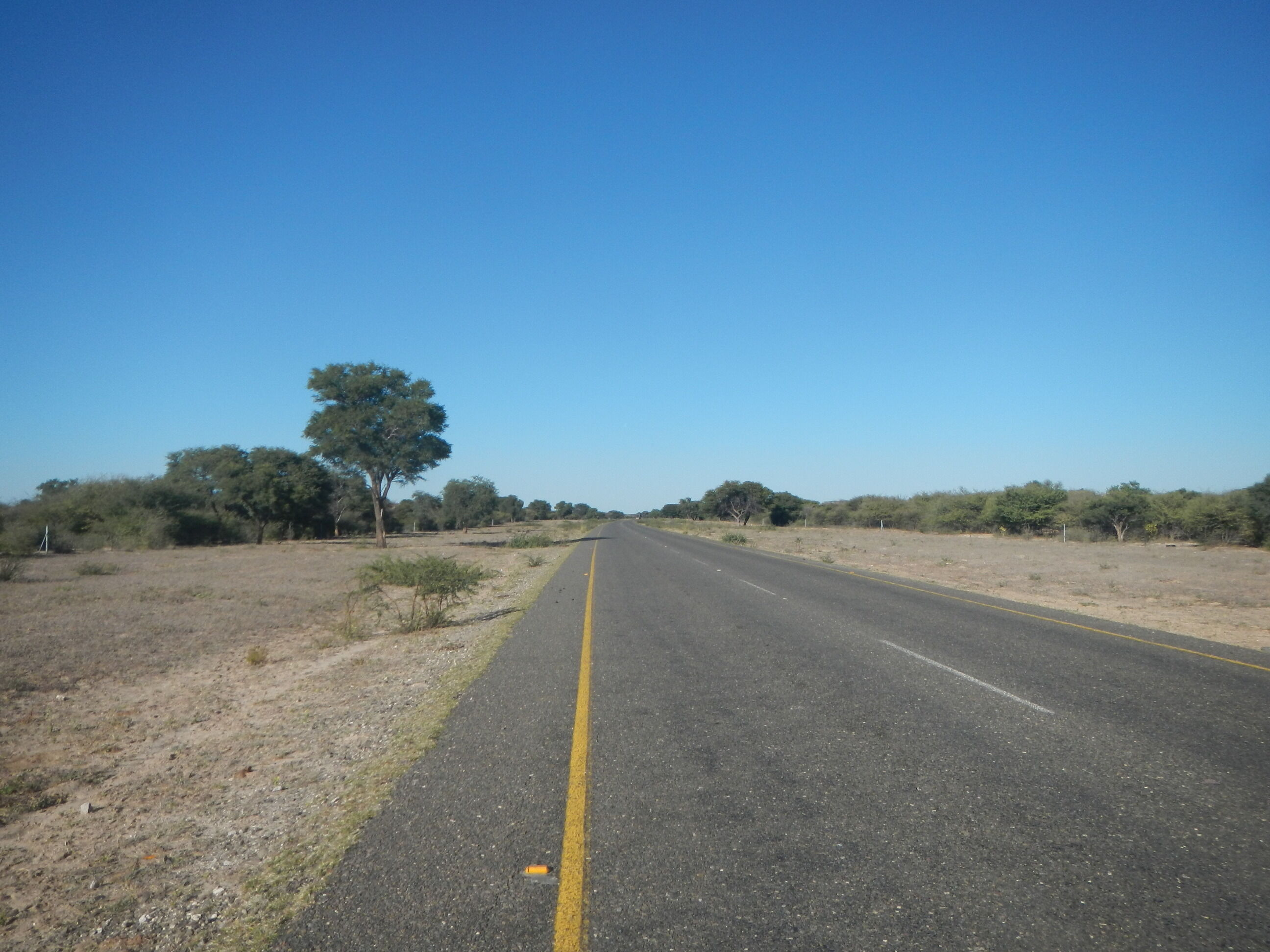 出発準備して砂地の道を200mほど自転車押して進めばそこが幹線道路だ。本当にボツワナはちょっとでも道路外れると砂に埋れて全く動けなくなってしまう道ばかりであり、仮に道路がなかったらこの国を自転車旅行なんてやってらんないだろうと思う。