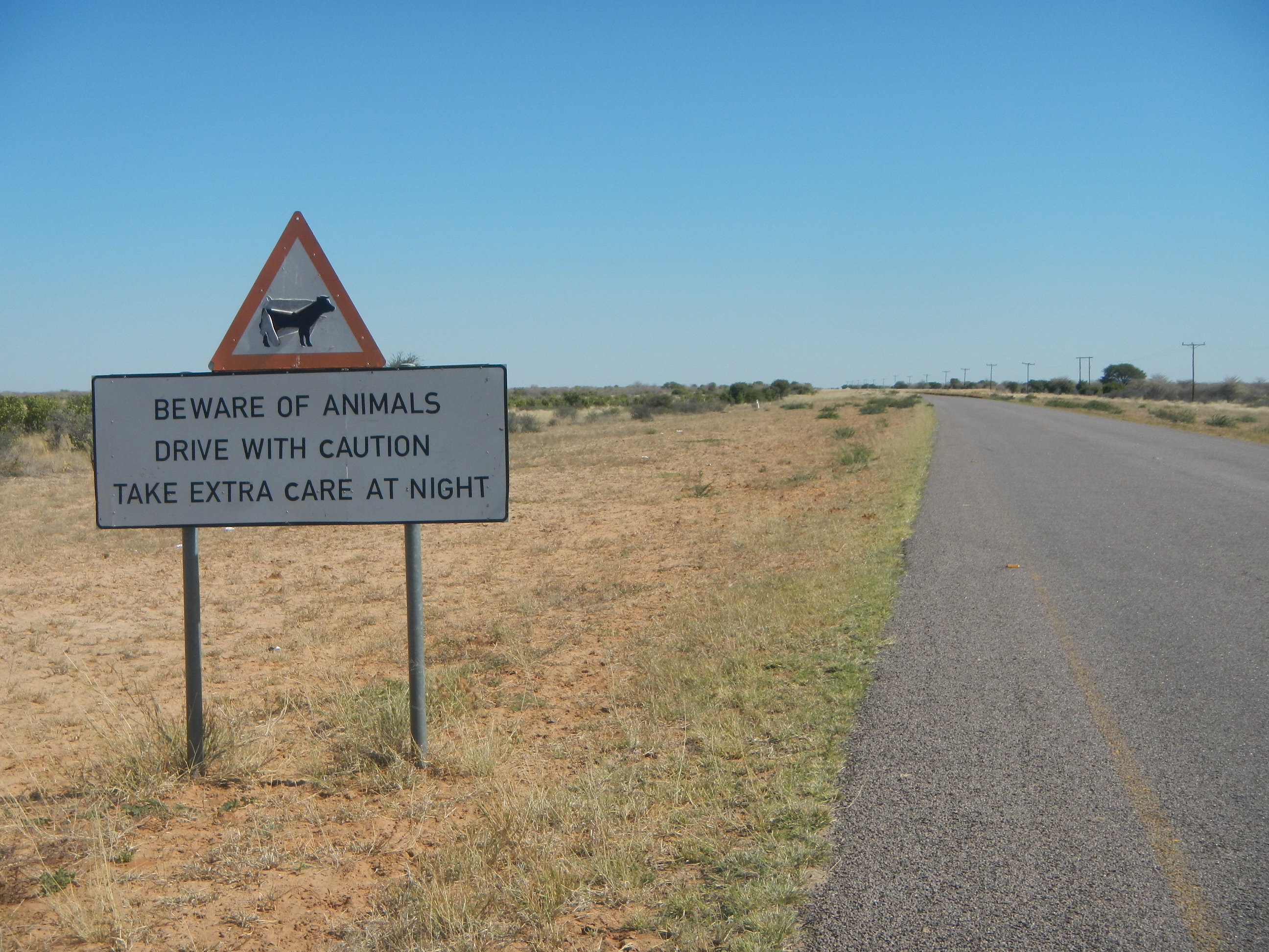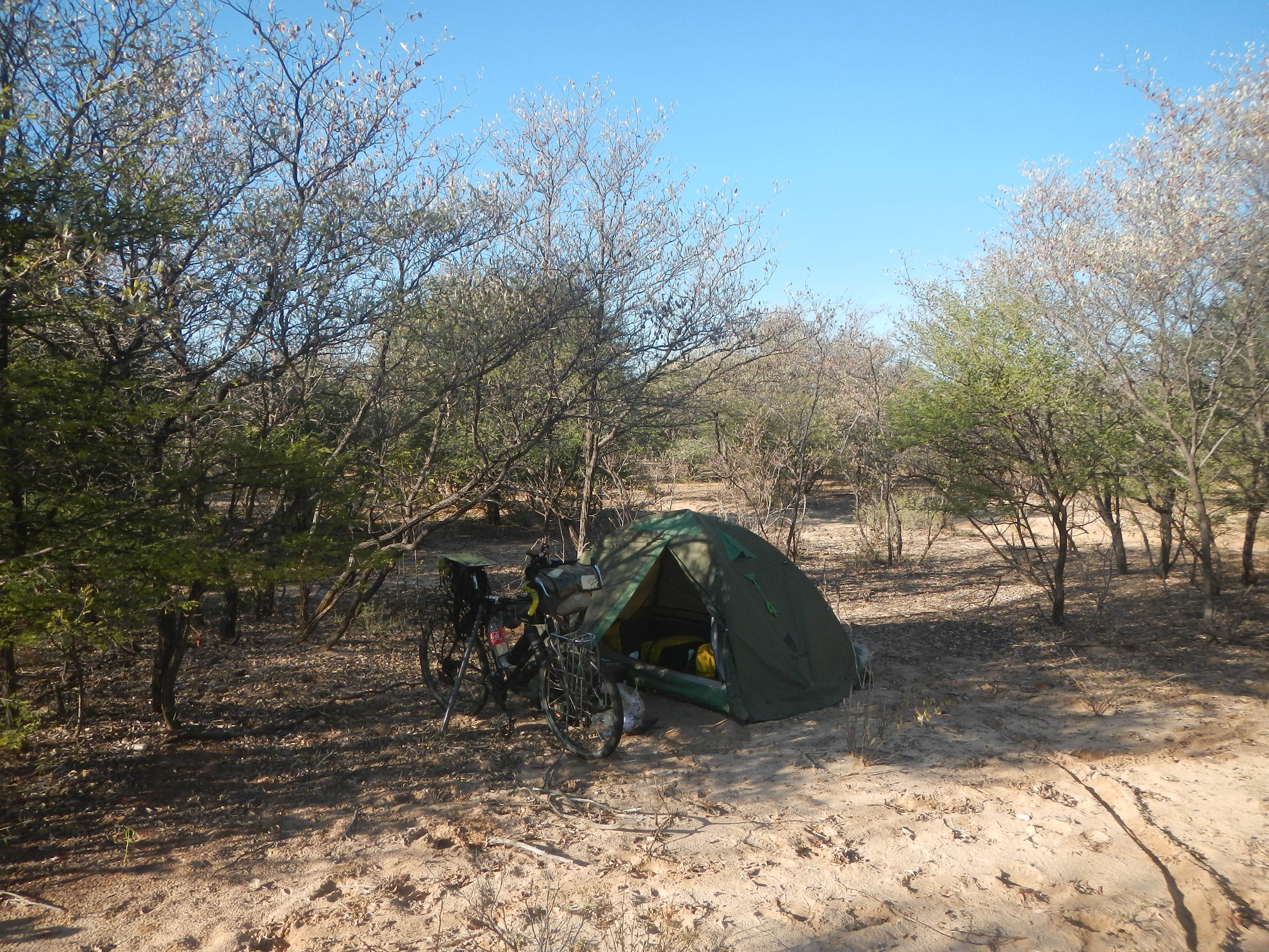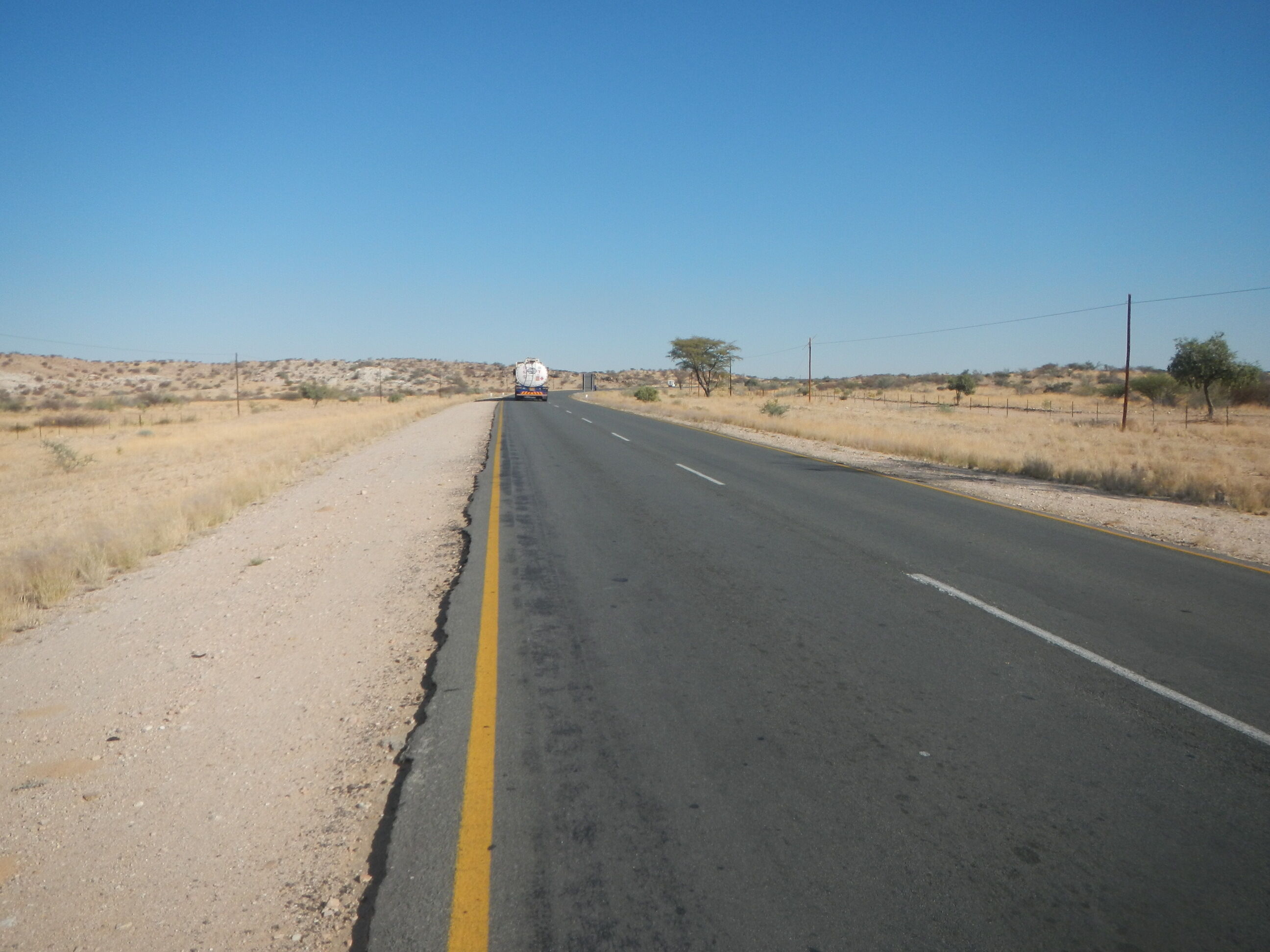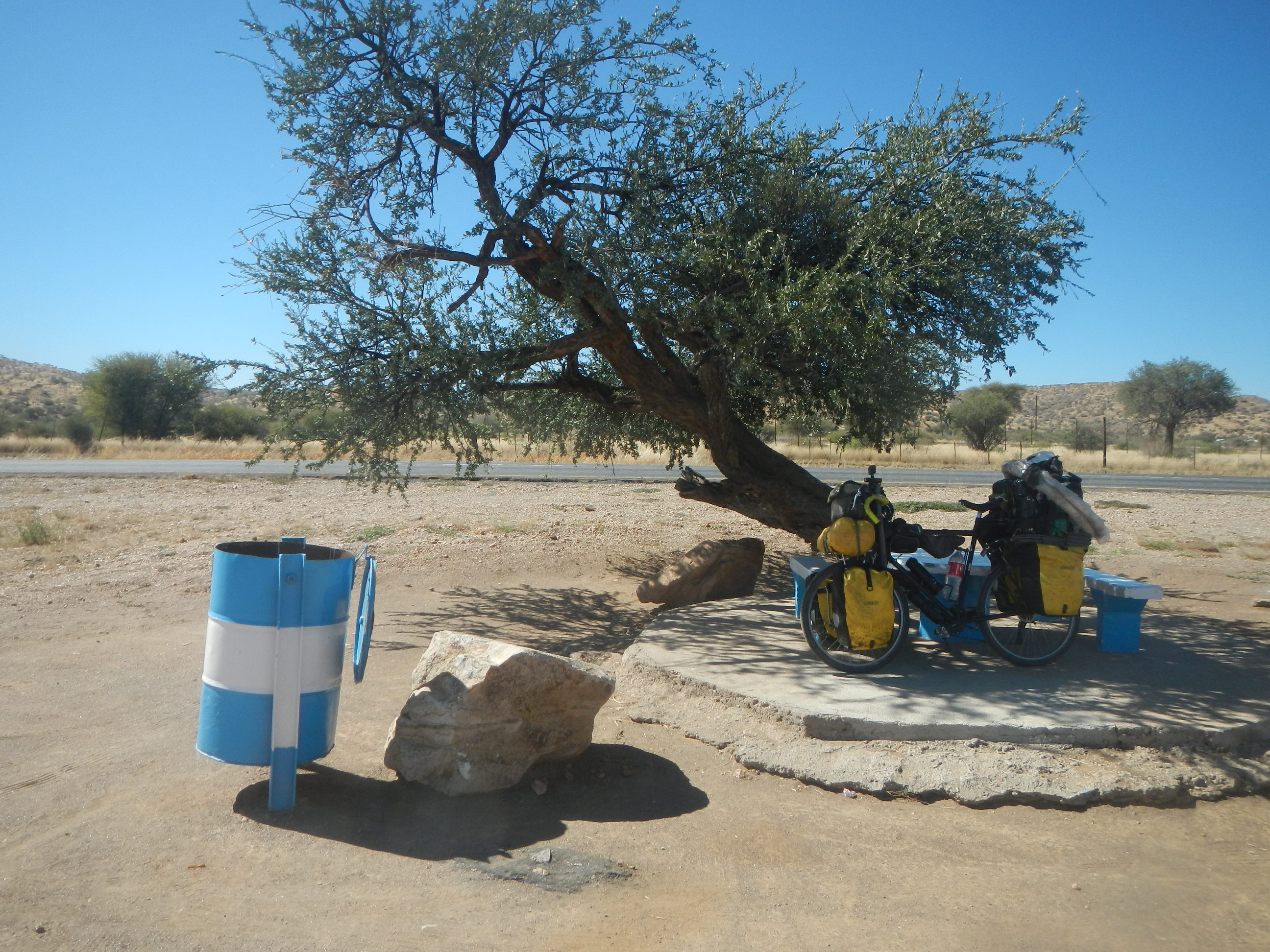 出発準備して砂地の道を200mほど自転車押して進めばそこが幹線道路だ。本当にボツワナはちょっとでも道路外れると砂に埋れて全く動けなくなってしまう道ばかりであり、仮に道路がなかったらこの国を自転車旅行なんてやってらんないだろうと思う。