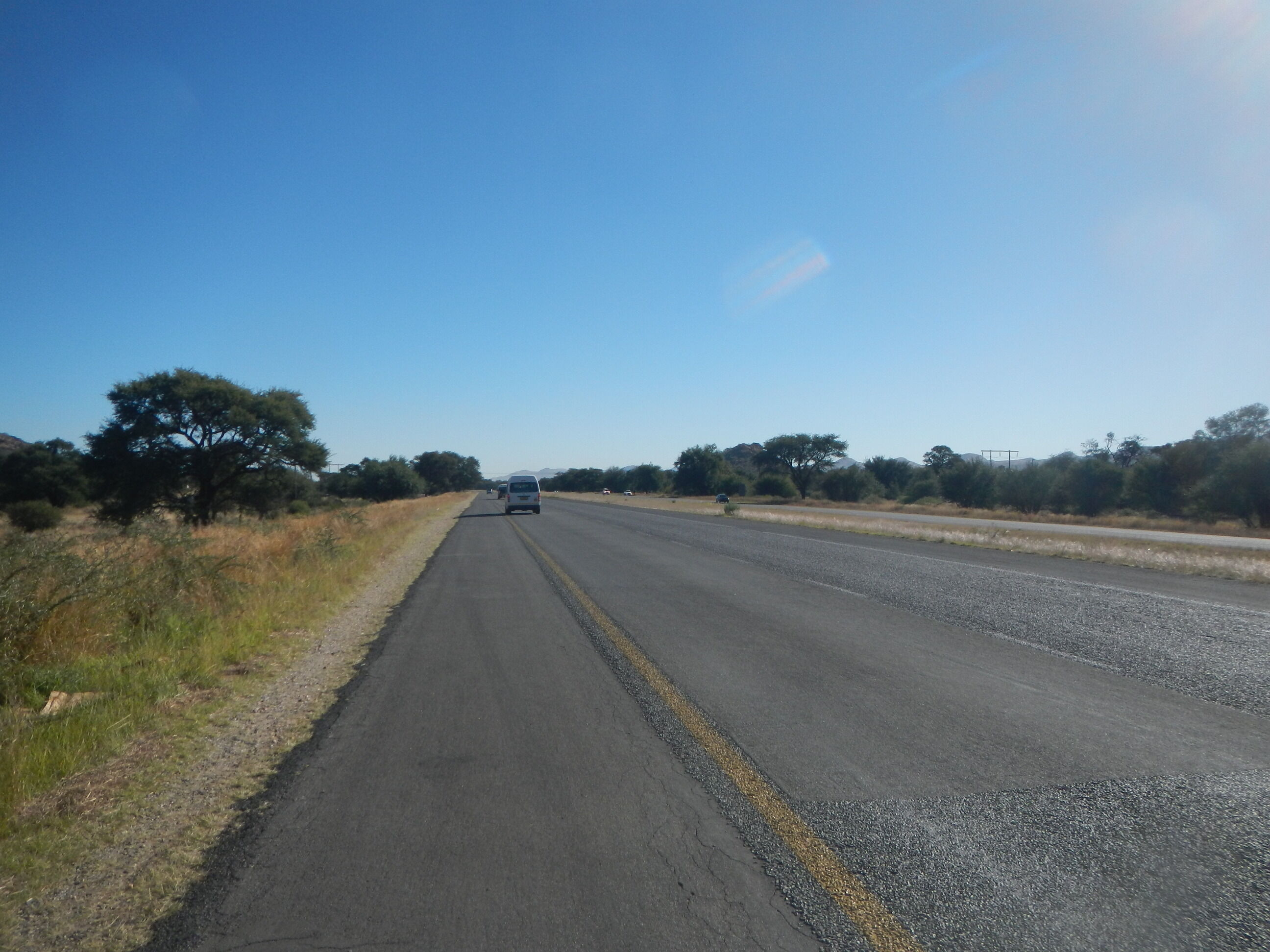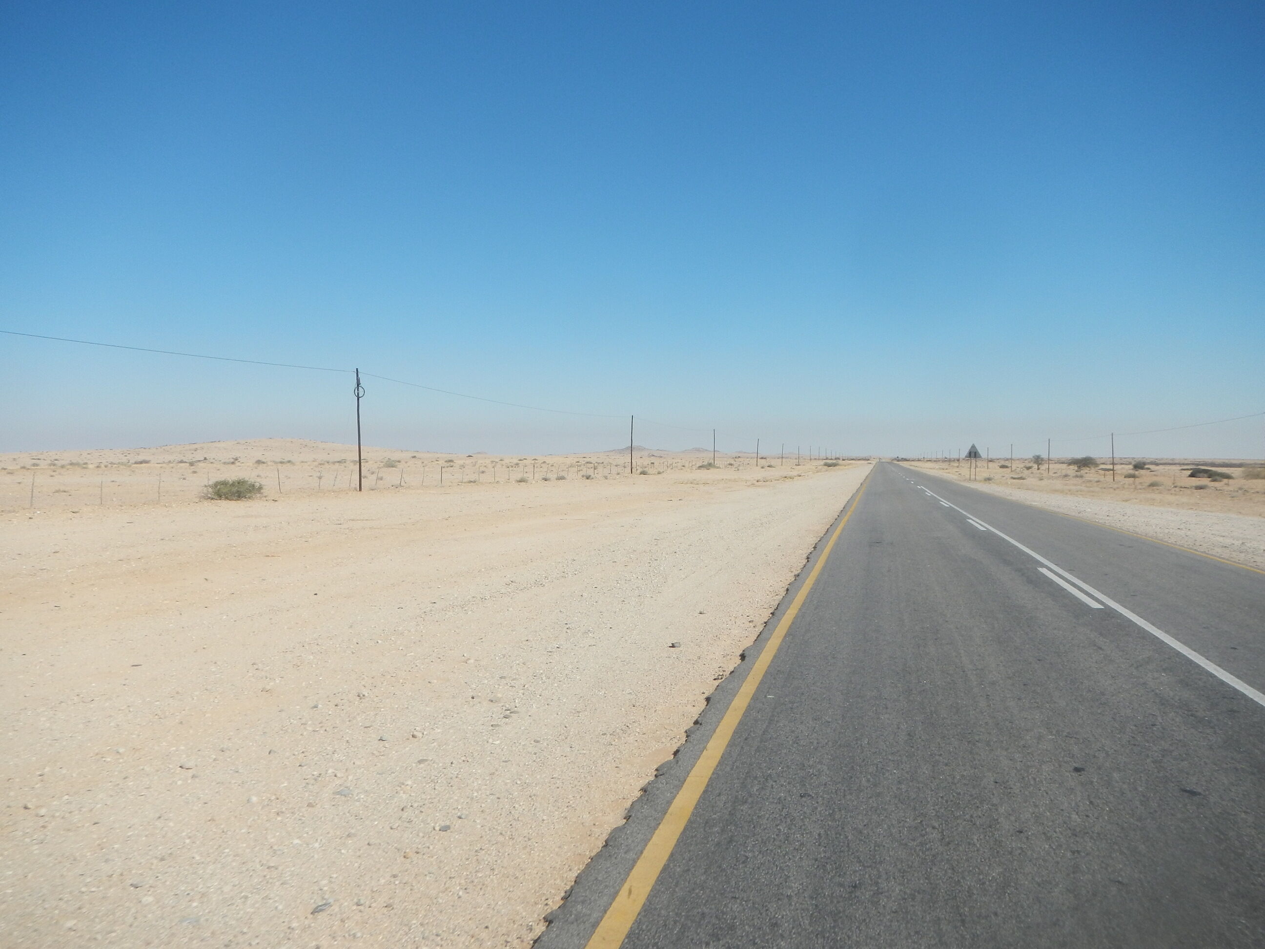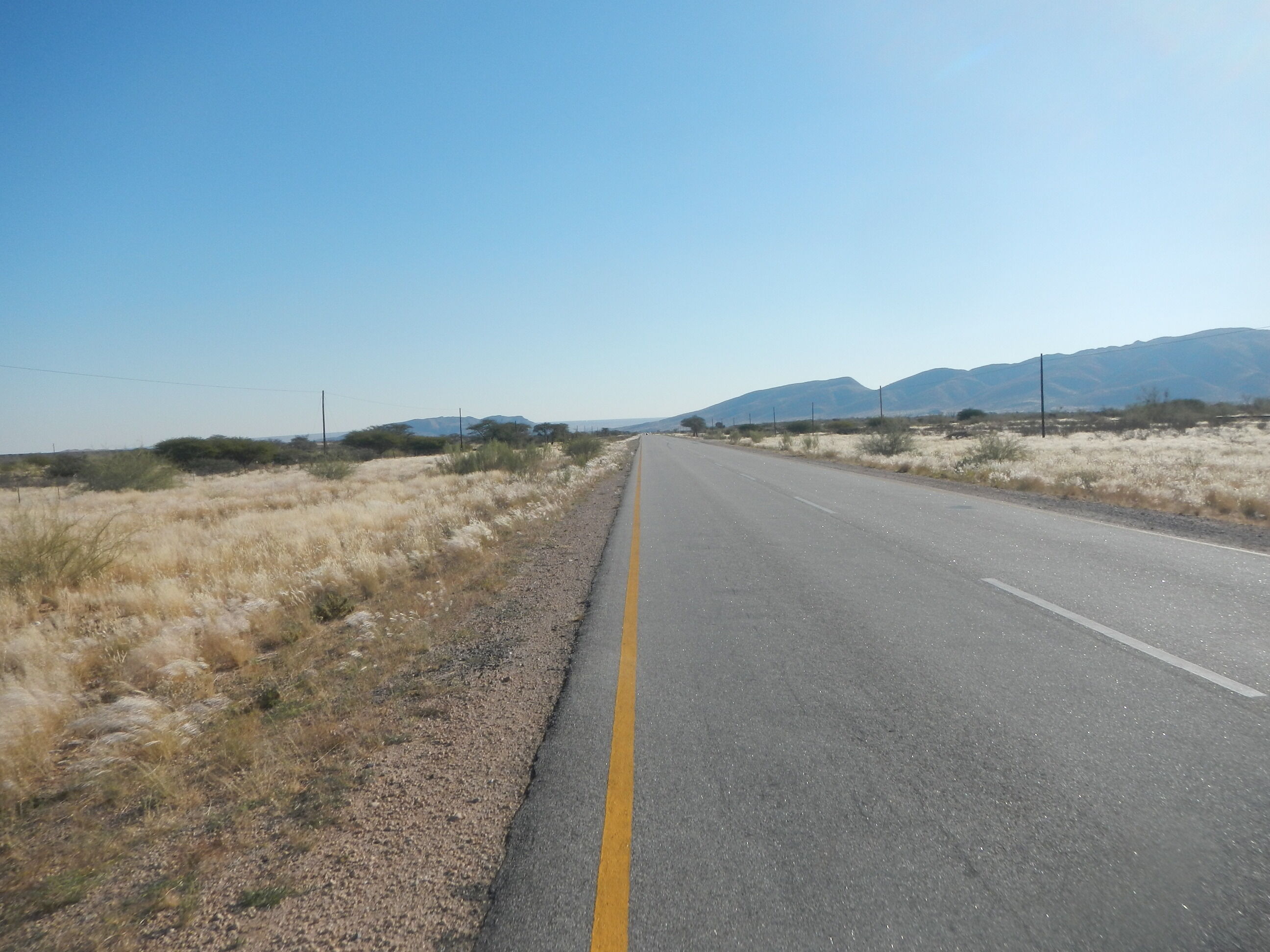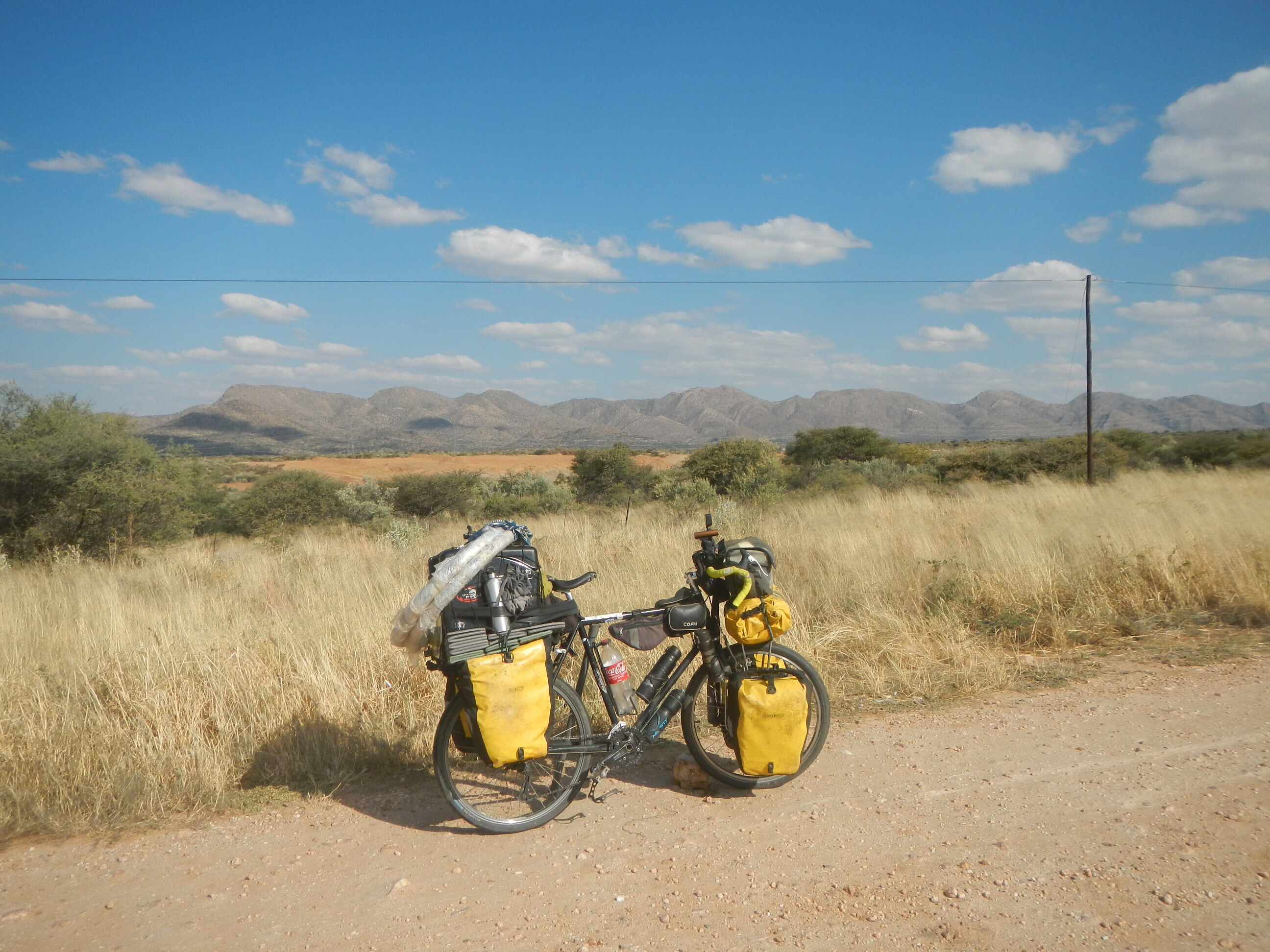 出発準備して砂地の道を200mほど自転車押して進めばそこが幹線道路だ。本当にボツワナはちょっとでも道路外れると砂に埋れて全く動けなくなってしまう道ばかりであり、仮に道路がなかったらこの国を自転車旅行なんてやってらんないだろうと思う。