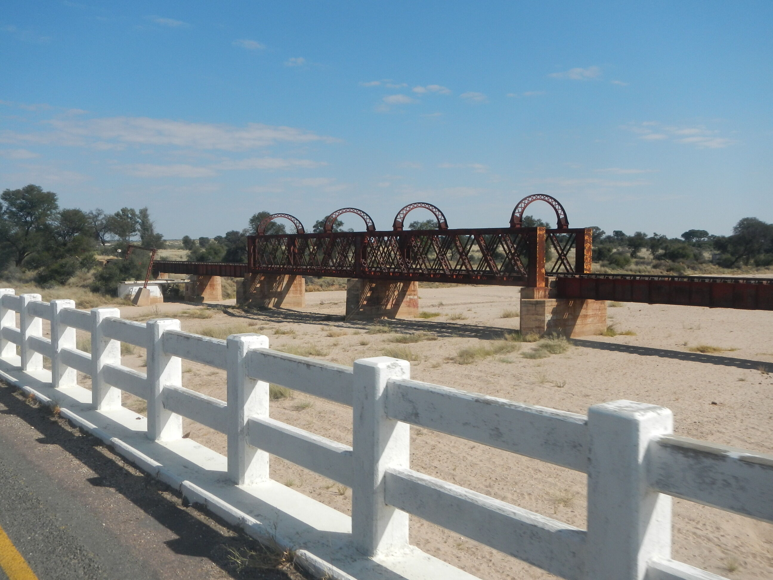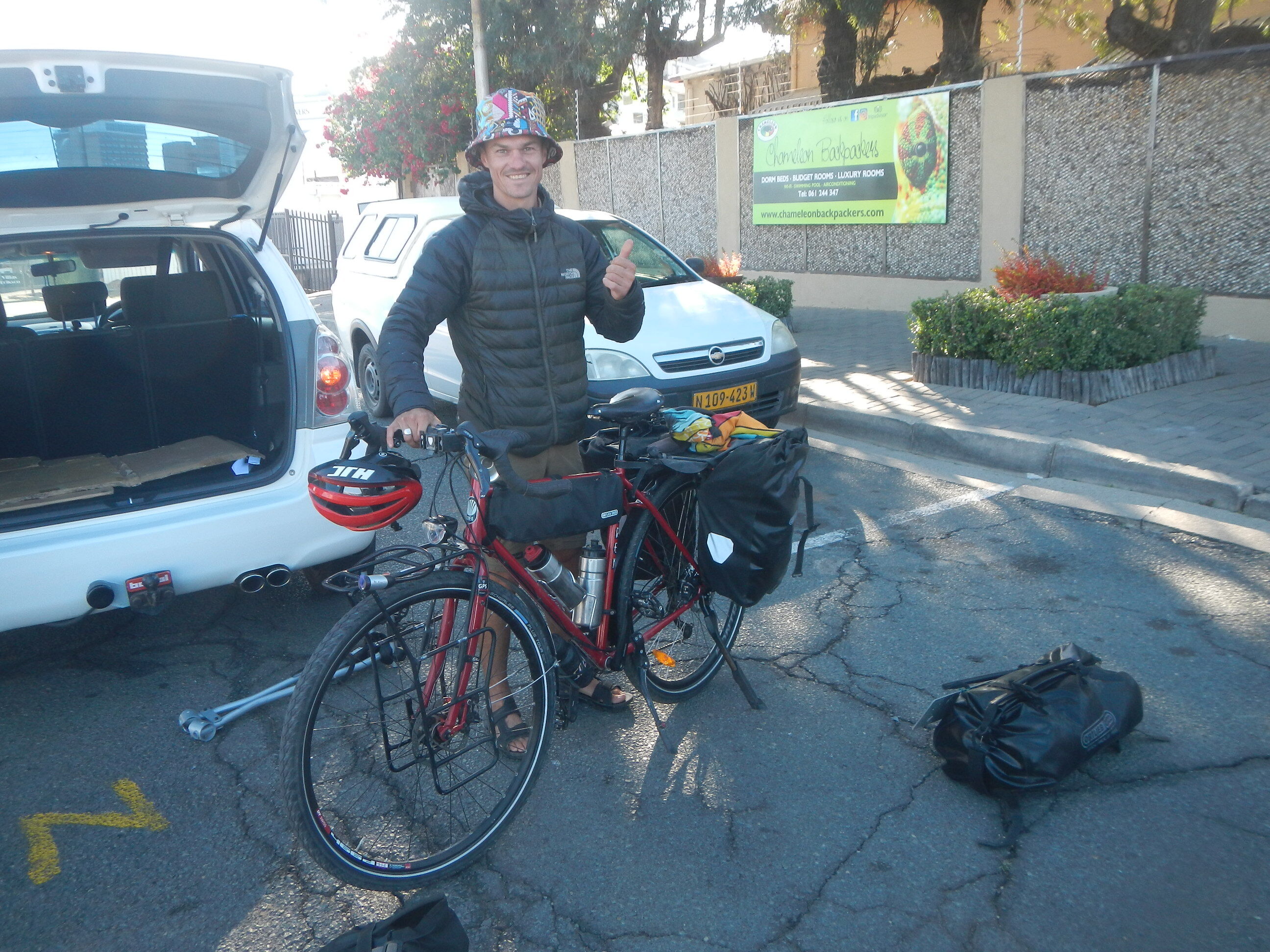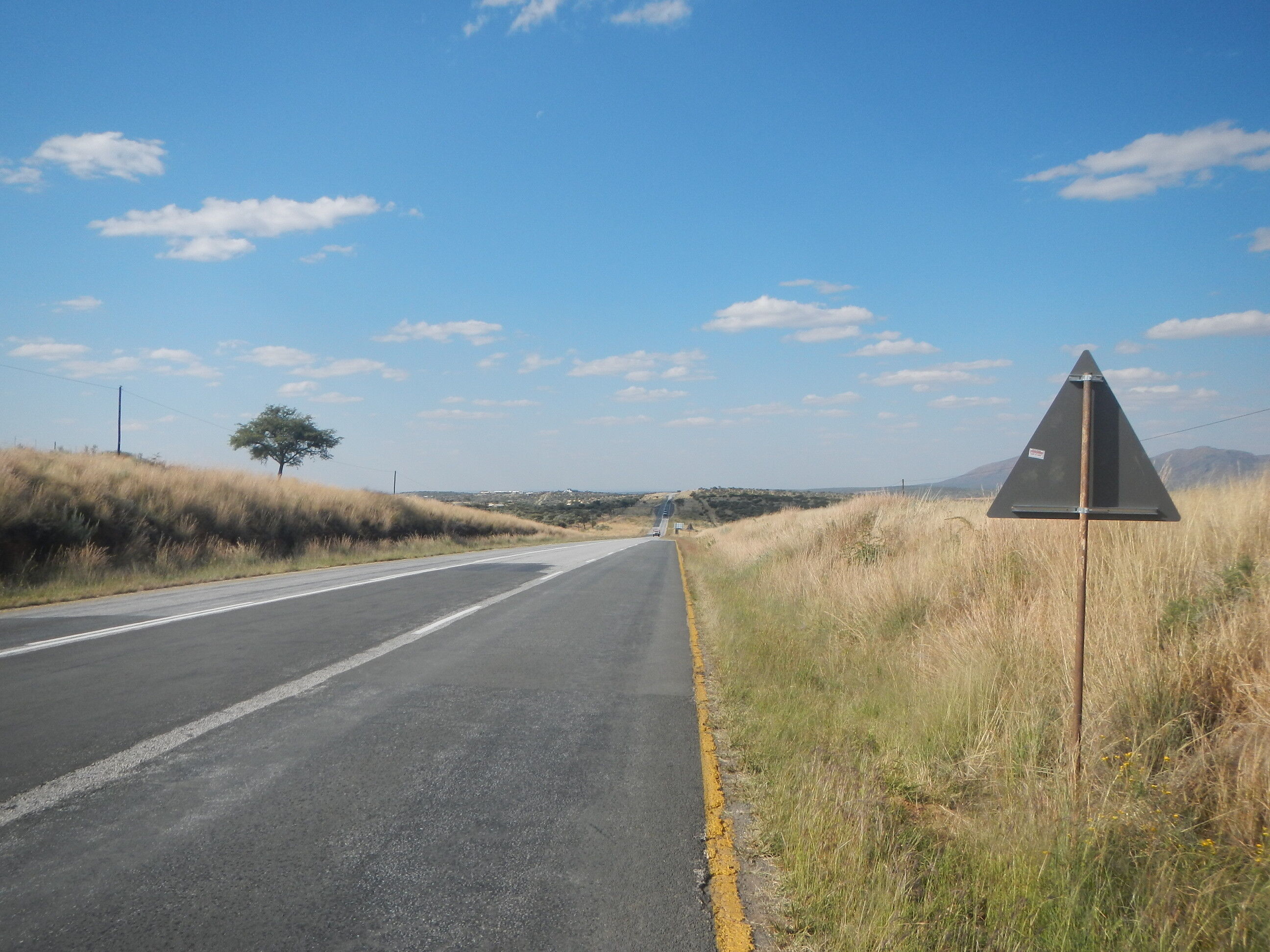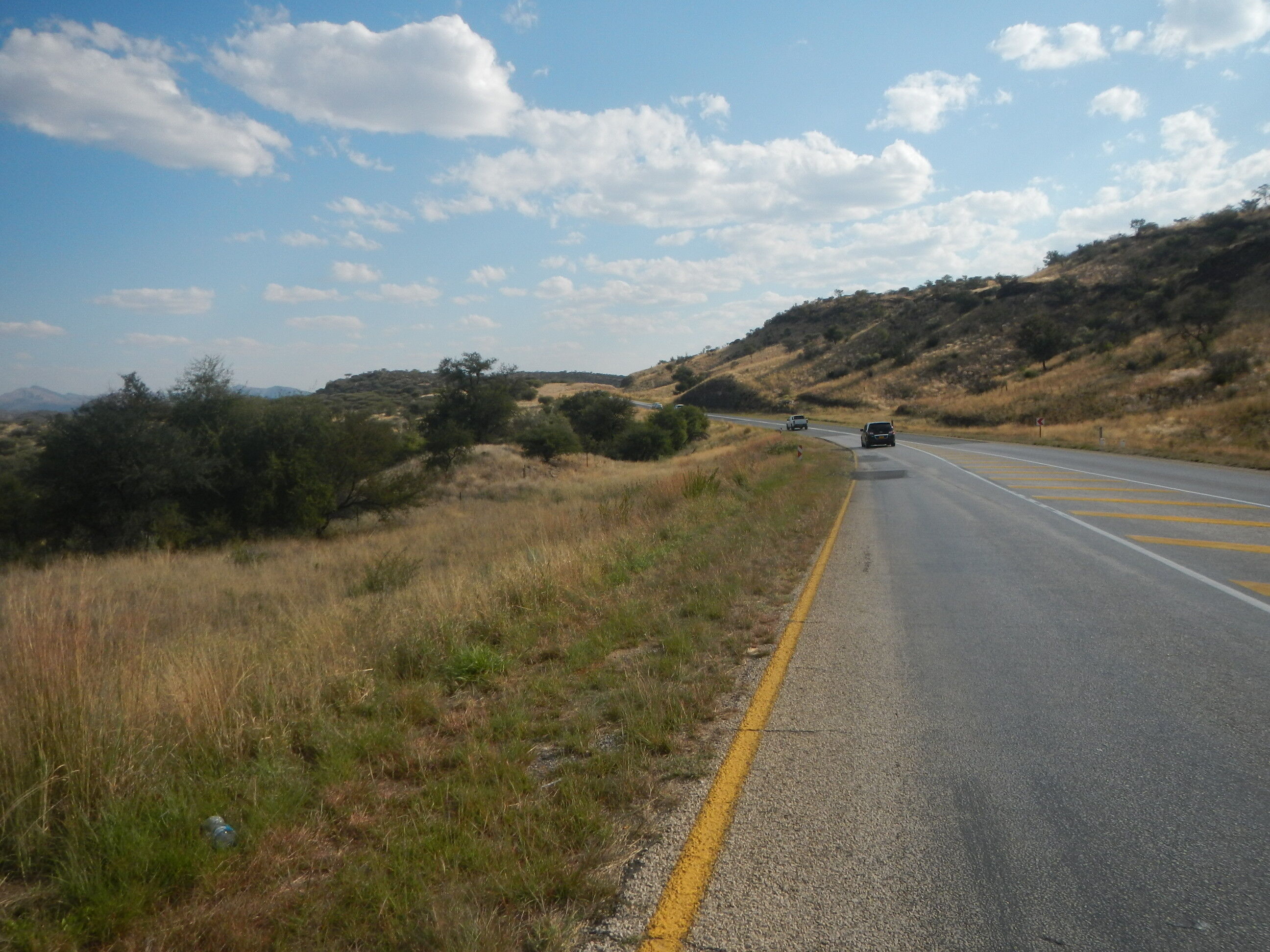 出発準備して砂地の道を200mほど自転車押して進めばそこが幹線道路だ。本当にボツワナはちょっとでも道路外れると砂に埋れて全く動けなくなってしまう道ばかりであり、仮に道路がなかったらこの国を自転車旅行なんてやってらんないだろうと思う。