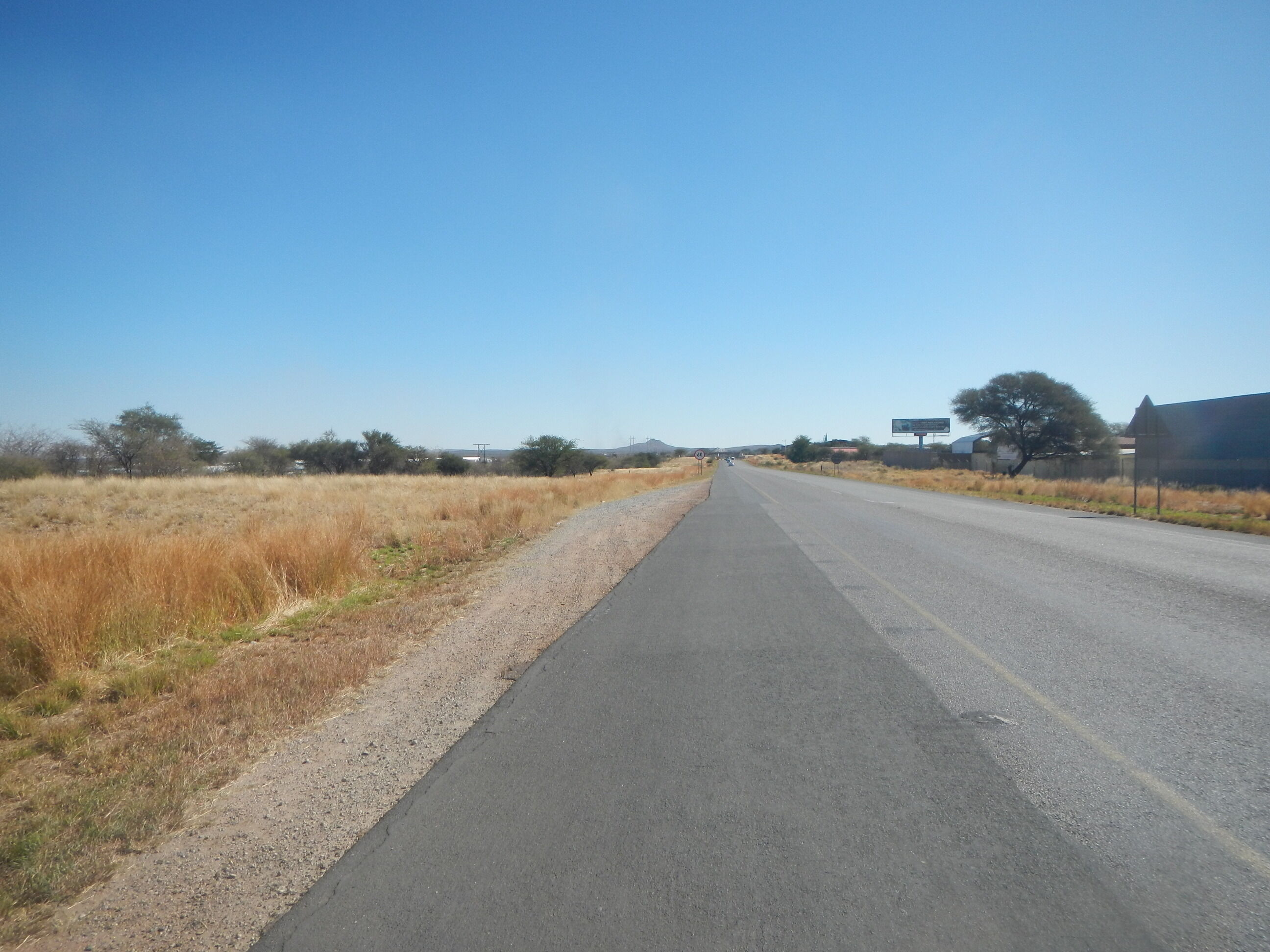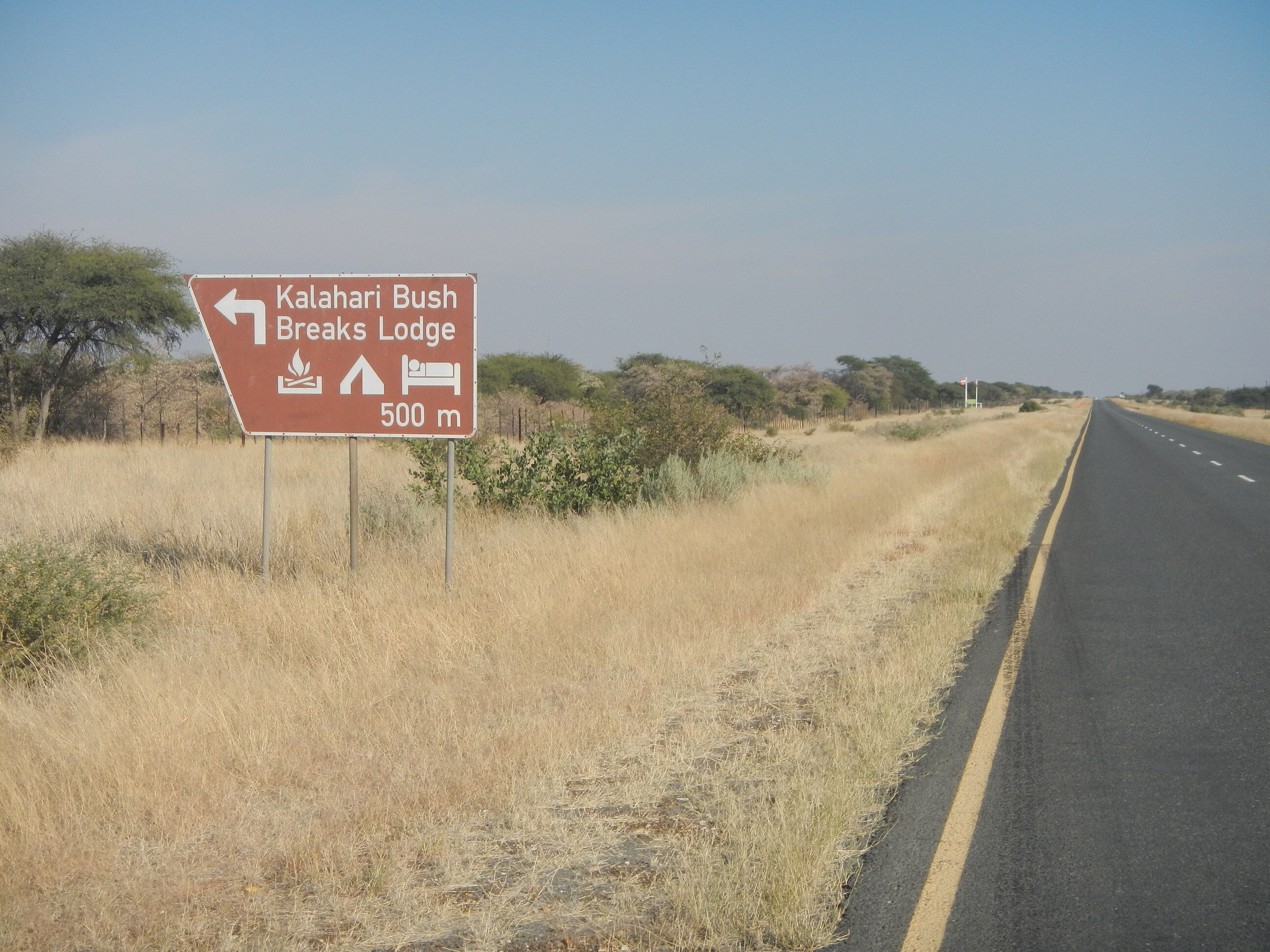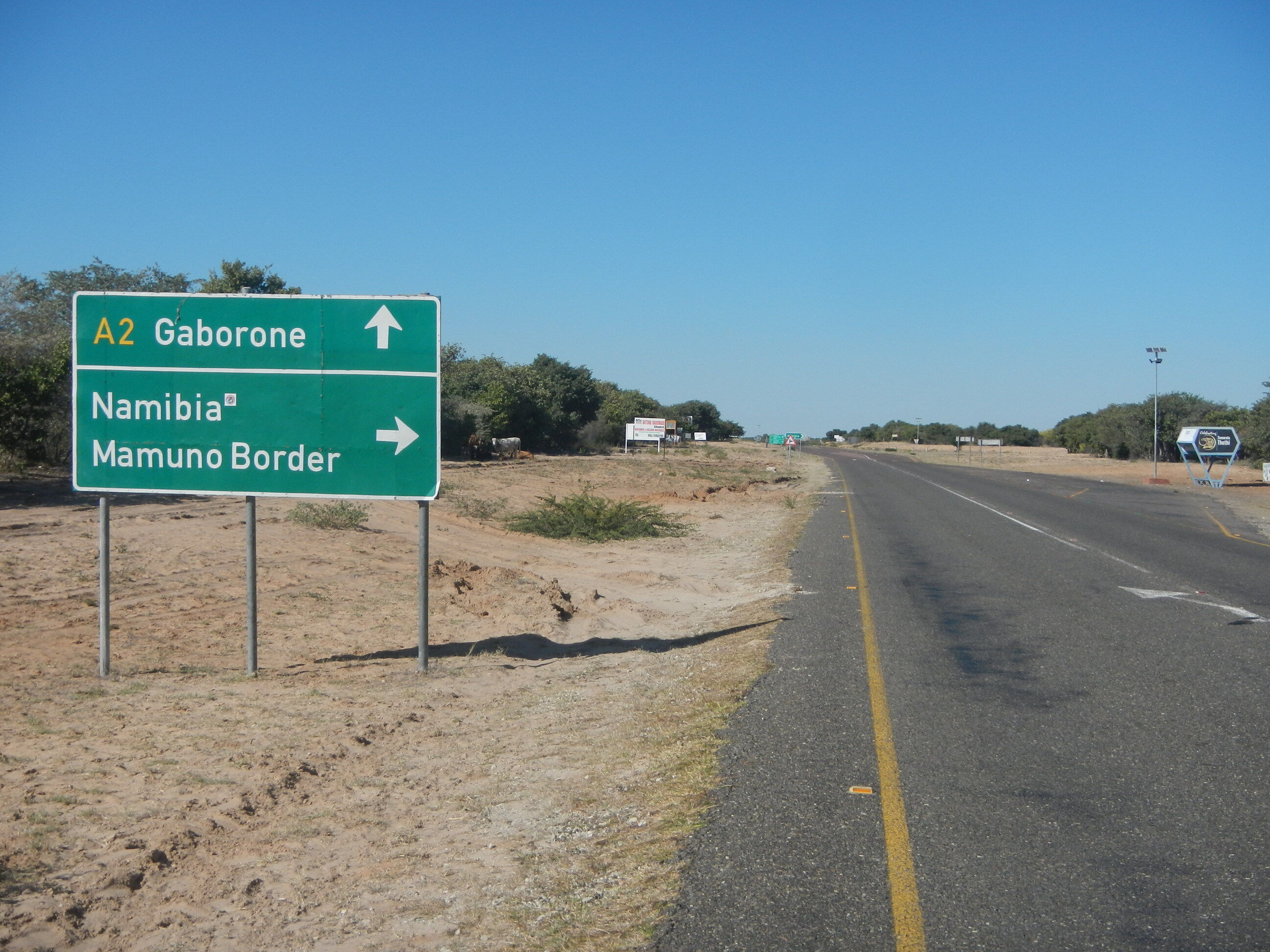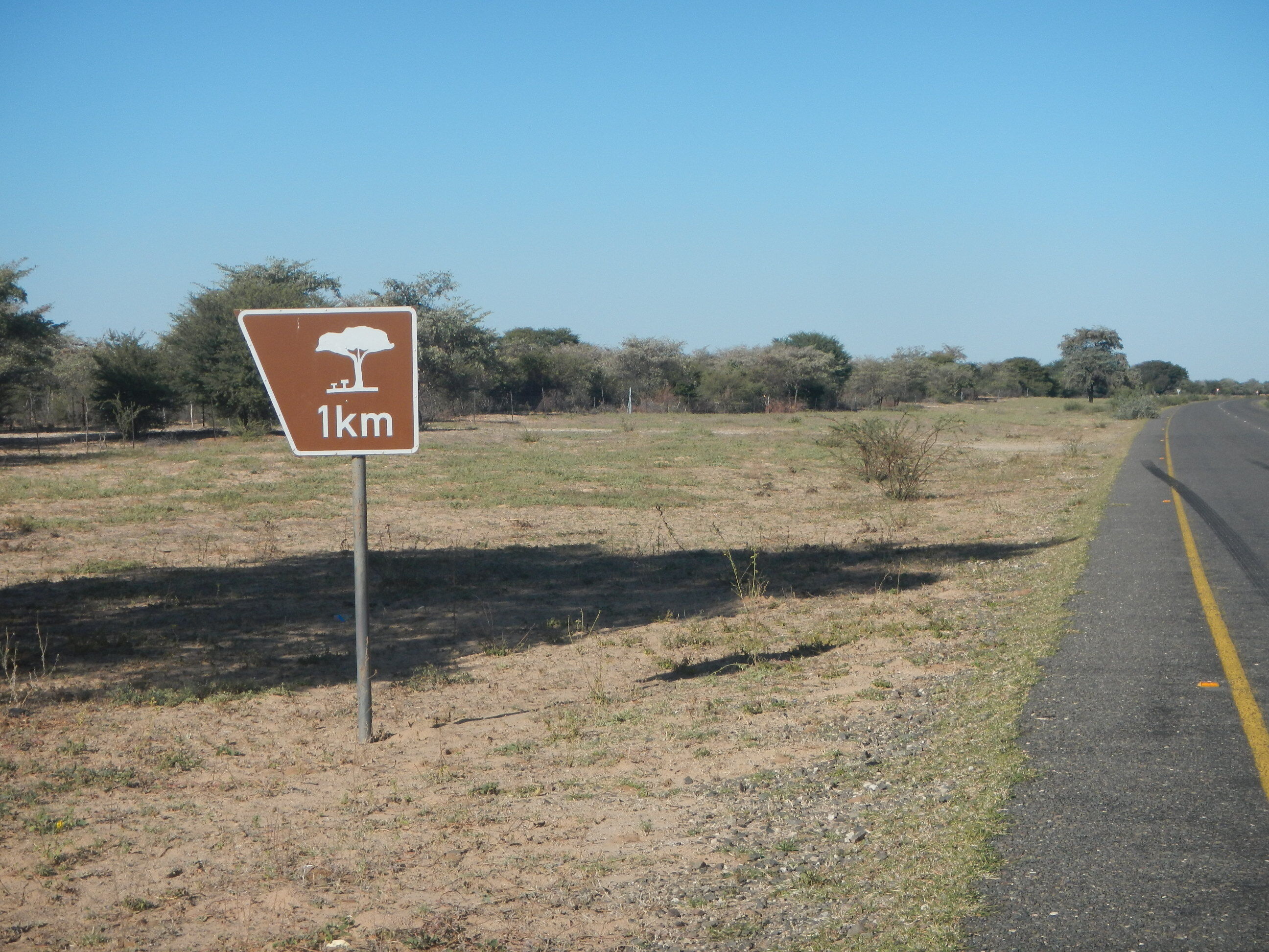 20kmほど進んだところで、ナミビア方面へと向かう道路が出現する三叉路に差し掛かる。こうした主要道路同士がぶつかる交差点というのは大きな町だったり様々な施設が立ち並んでいるのが常だけど、ボツワナじゃそうはいかない。