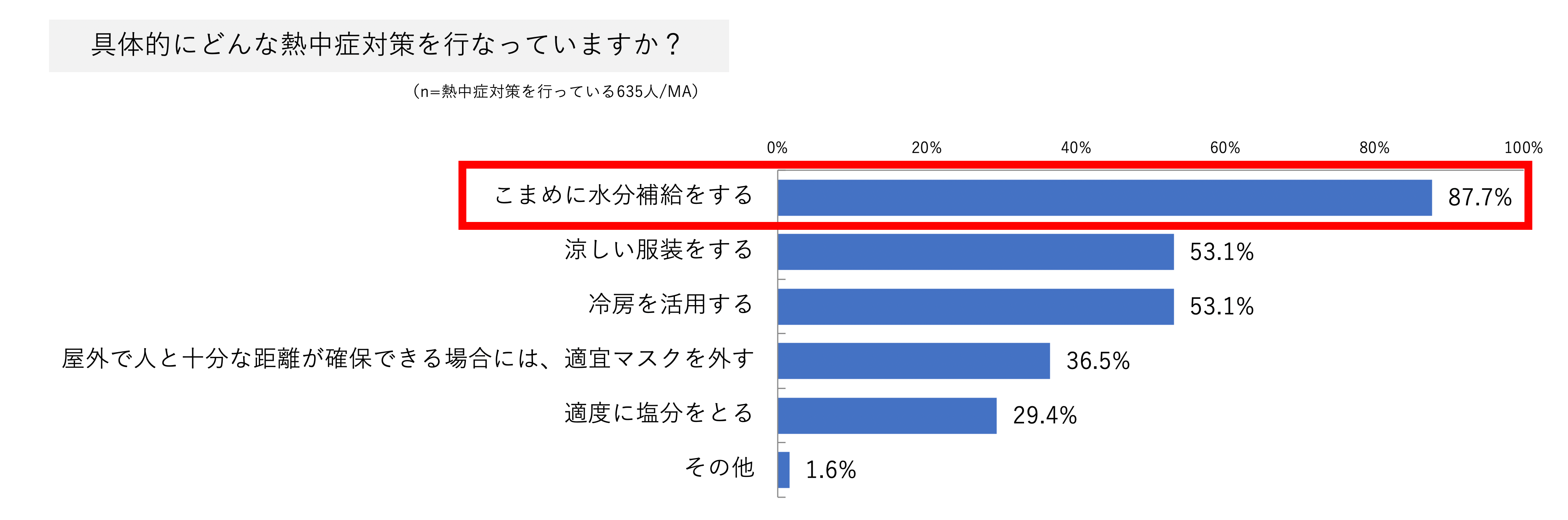 一方で、「例年以上に熱中症対策を行っている」という人は27.9%。「例年と同じくらい、あるいは例年よりも対策を行っていない」が54.5%と最も多く、「熱中症対策をしない」という回答は17.5%にのぼった。