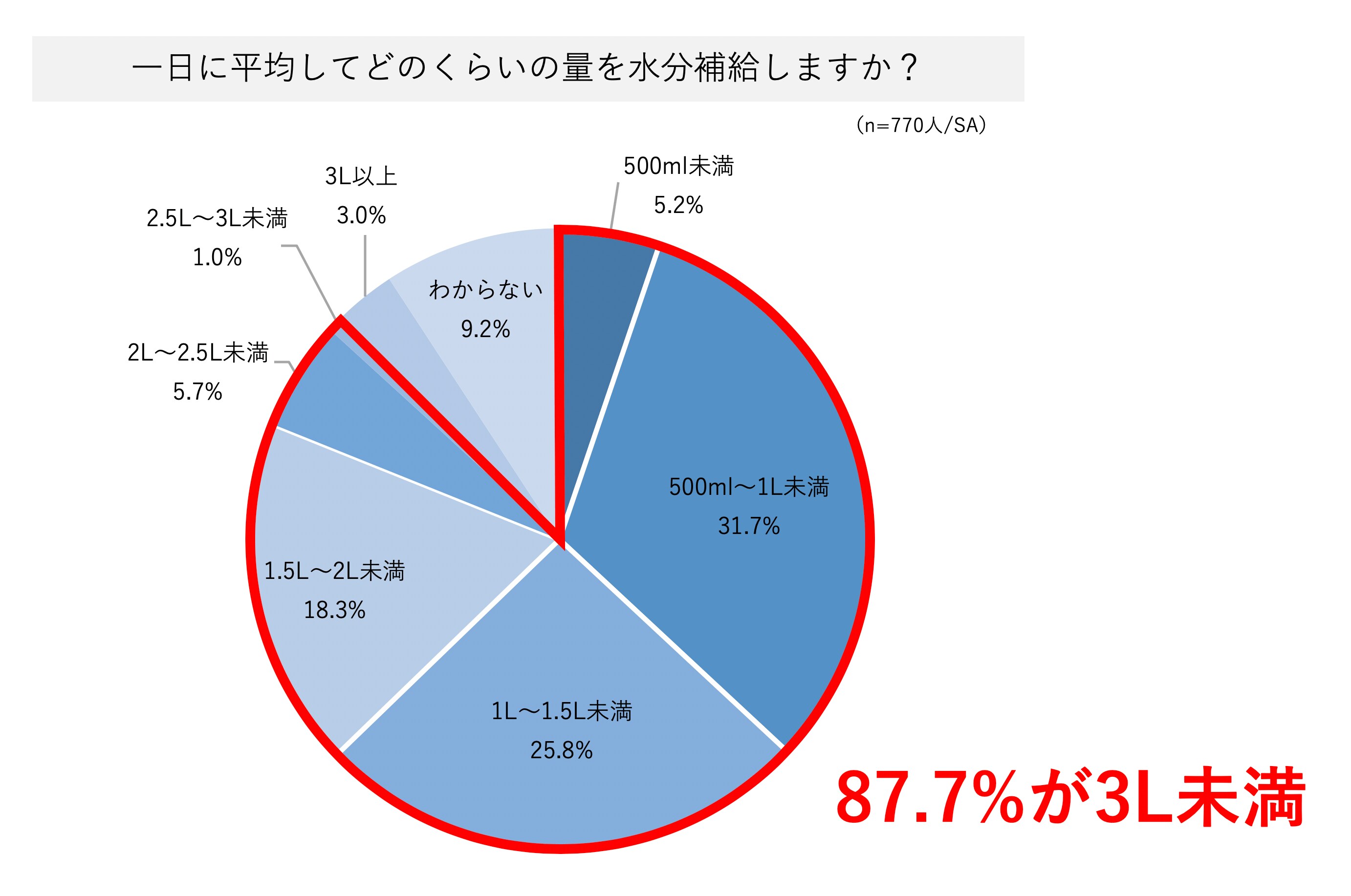 しかし、調査結果を見てみると、この「3L」を摂取できている人はわずか3.0%。ほとんどの人が「1日に3L未満の水しか飲んでいない」ということがわかった。