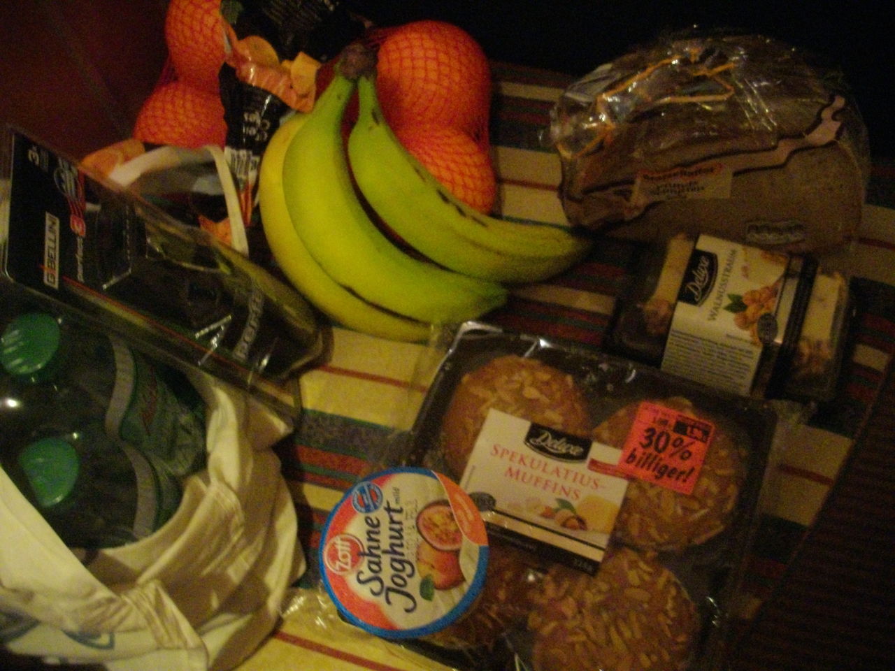 左下から時計回りに 水、ひげそり、バナナ、オレンジ、パン、チーズ(クルミ付き)、マフィン、ヨーグルト