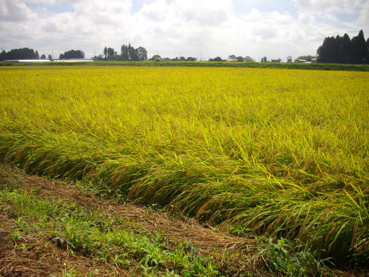 写真手前と他の部分を比べると手前の稲は少し倒れ気味ですが、品種が違うので実り方に違いがあります。