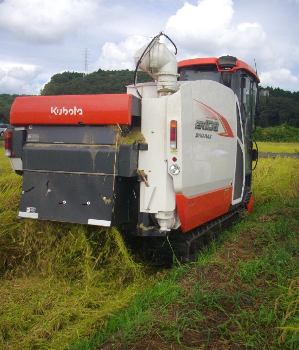 ・1束ずつ刈り取りをした後にコンバインを見ると、刈り取り・脱穀・モミ排出ができる機械の機能がはっきりする。