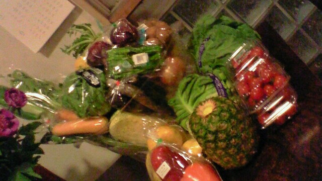 このバーベキューのために購入した野菜の一部。他にも冷蔵庫にしまった野菜、帆立、スペアリブ、鶏もも、ラム肉ソーセージ等々大量の食材を購入。エマさんとエネルギー(=酒)補給しながら下準備しました。