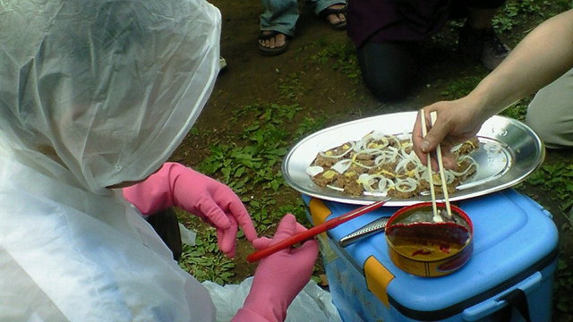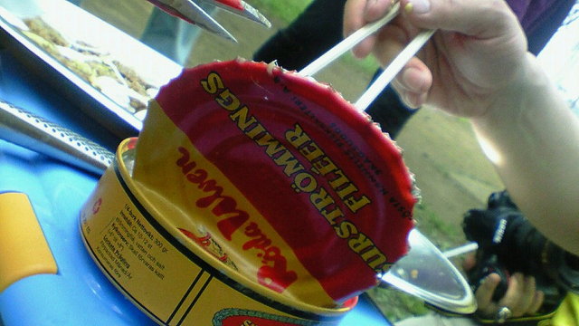 ついに!噂のシュールストレミングをいただきました。エマさん主宰グルメキャンプ部の第一回目のイベント、木場公園バーベキューでのことです。突然現れた完全防備の男性に周りもちょいびっくり。でも臭いはあまりしないような…あっ、風向きでけっこう来る。でもみんながいうほどそんなにひどい香りではないかも…。私にはうまもつ醤油煮の香りの方がかなり刺激的でした。