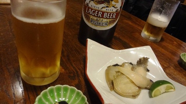 注文した蒸し鮑。勝手に煮鮑だと思い込んでいました。煮鮑も好きだけれど、この蒸し鮑は磯の香がそのまま生きていて、良い歯ごたえ。噛めば噛むほど旨みが出る、鮑ならではの味わい。ビールもいいけれど、やはり日本酒かな、ということで冷酒を注文。