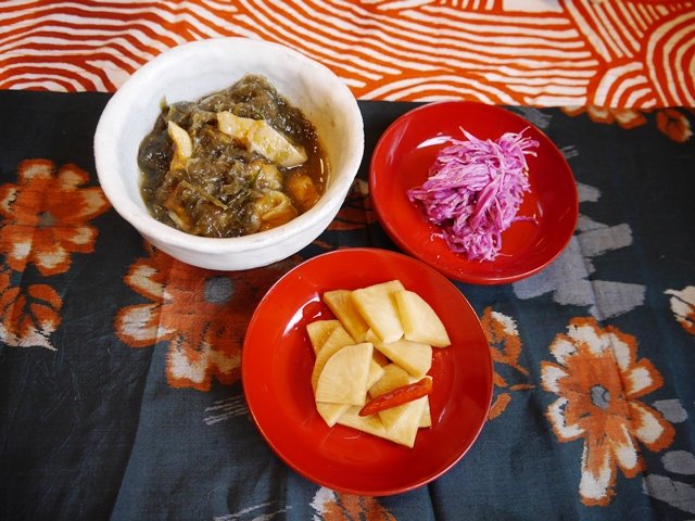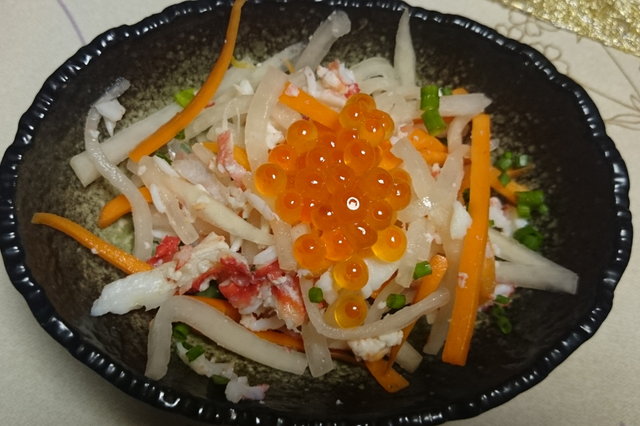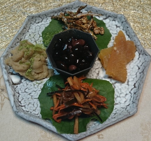 お節料理は、鶏の松風、明太子入り卵焼き、おいものたいたん、たたき牛蒡、薬膳煮しめ、鴨のロースト山椒風味、千枚漬けの鮭ルイべ巻き、椎茸と手綱蒟蒻の煮物、なます、菊花蕪、海老のふき味噌焼きを作りました。