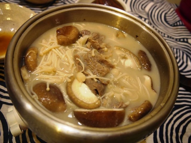 メインは豆乳茸鍋。和牛も入れました。