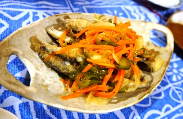 こちらもmayugebaさんが持ってきてくださった、小鯖の南蛮漬け。鯵でもワカサギでもなく小鯖ですって!しかも釣った鯖。程よい酸味で骨まで軟らかくいただけました。幸せ〜。