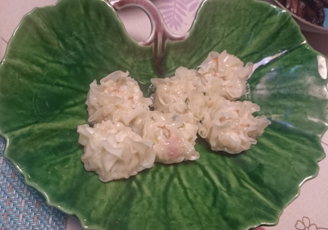 3日の夜ごはん。余っていた蟹と鶏ひき肉で焼売を作ってみました。ふわふわ美味しくできた!いつか有田で一緒に買った蓮の葉っぽい器に盛り付けました。