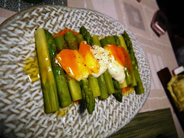 晩御飯。道の駅むなかたで買った太いグリーンアスパラは茹でて温泉卵乗せに。