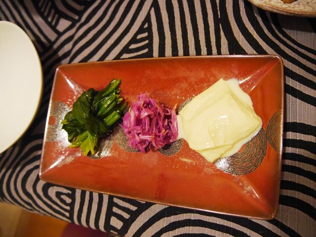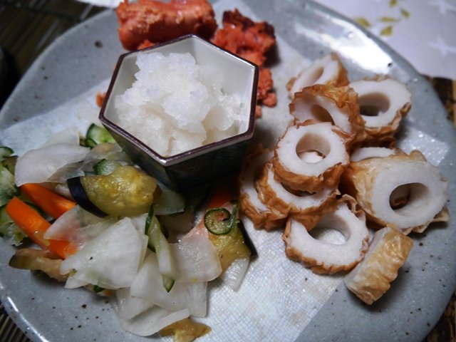 昨日作っておいた出汁醤油漬けとピクルスをまずお出ししました。