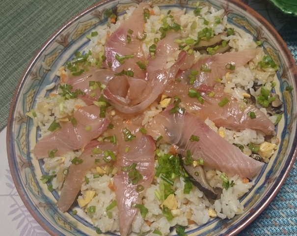 そして残った椎茸の煮もの、明太子の卵巻き、菊花蕪、にんじんの煮もの、大根の葉の塩漬けは細かく刻んでちらし寿司の具にしました。上にカンパチの漬けを乗せて完成。いくらをちらしたらもっときれいだったかな。これでお節およびお節用に買った食材はほとんど使いきりました!