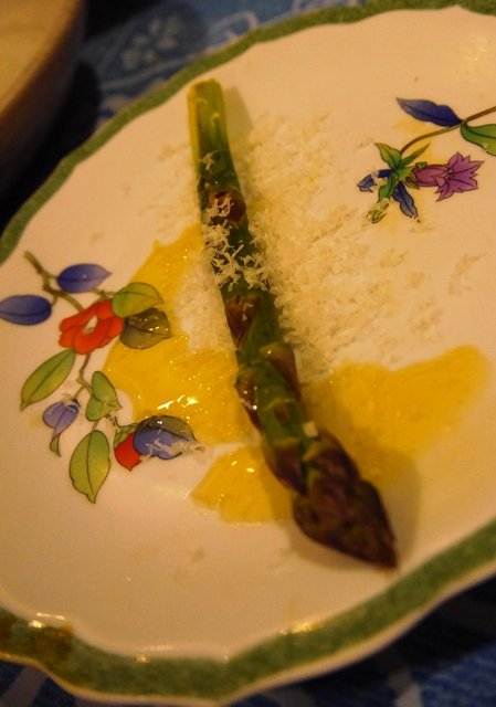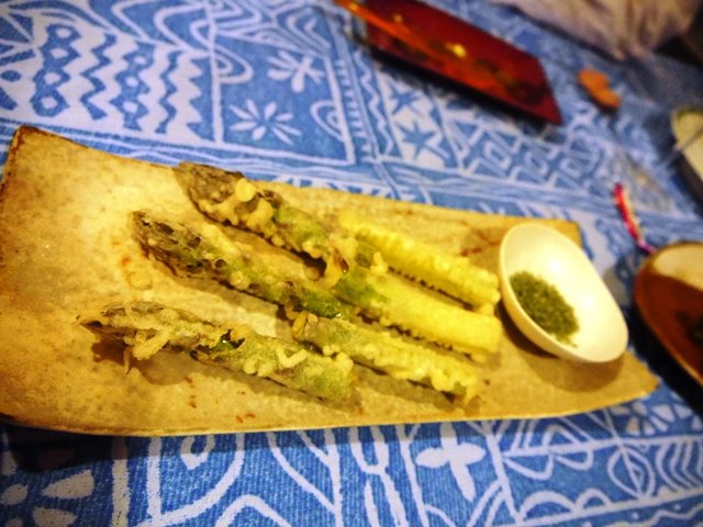 お皿の選択を誤った。もっと黒っぽいお皿の方が料理がひきたったかも。アスパラの天ぷらです。