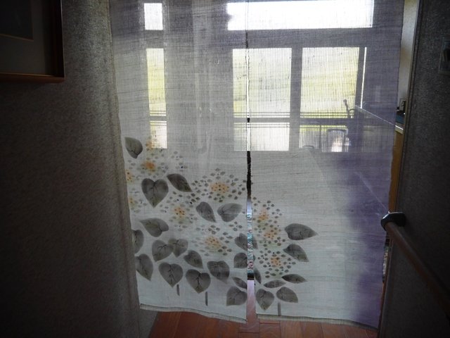 うちのダイニングから玄関を見た写真。この暖簾はどこで買ったかな、小千谷だったかな?白にひまわり?いや、紫陽花か、、、。涼しげです。