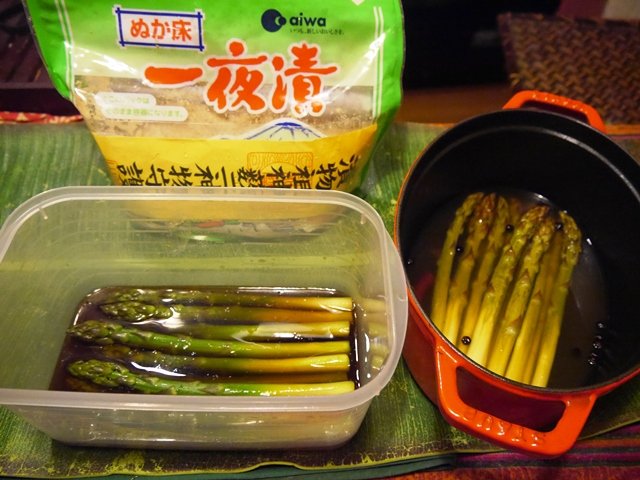 奥に見えているのは名古屋へ行った時に訪れた萱津神社で購入した糠床。こちらにもさっと茹でたグリーンアスパラを入れて、準備完了。