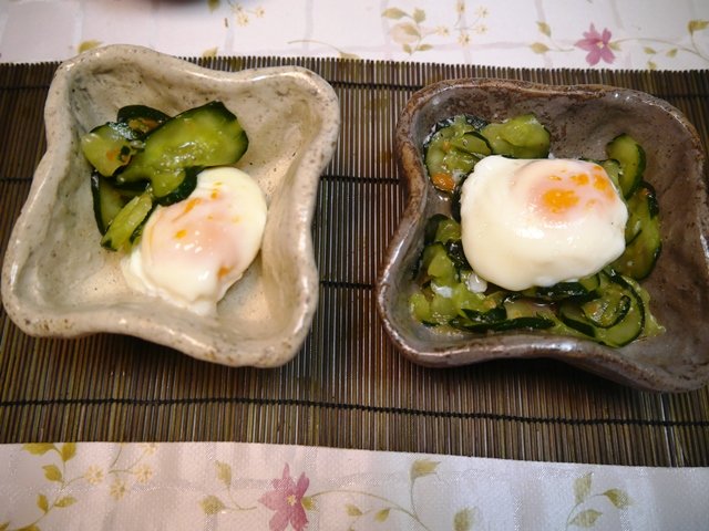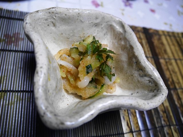 出発の朝、明太子和えのイカときゅうり、ワイルドな山椒を母手作りの器で。