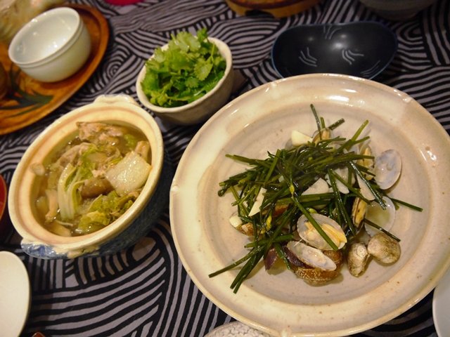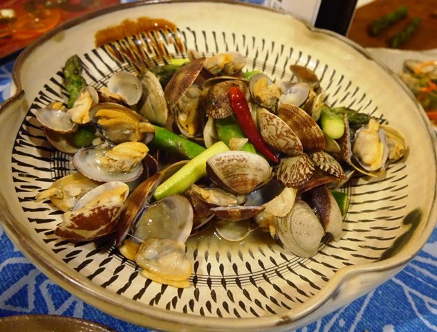 あさりは花ニラと一緒に酒蒸しに。花ニラ、味が濃くて美味しい。