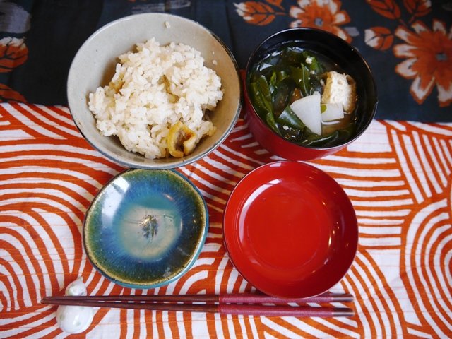 翌朝のご飯は母手作りの器で登場。秩父の陶芸家三上さんのところで作った器です。