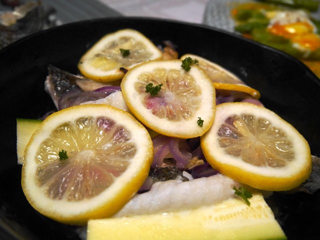 イサキは塩レモン焼きにしました。一緒に入れた臼杵のズッキーニが、イサキと白ワインの美味しい味を吸い込んでとっても美味しかった♪
