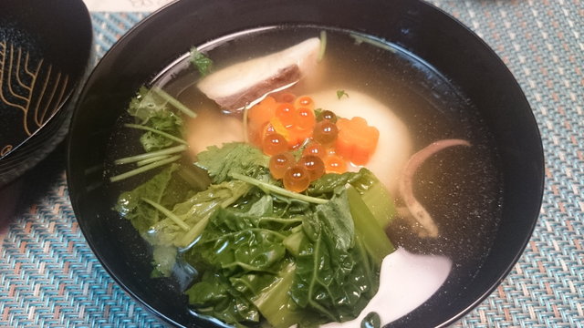 そしてお雑煮はぶり、ではなくカンパチ。かつお菜と丸い焼き餅、飾りの三つ葉とにんじんと柚子、そして出汁はアゴ出汁とカツオ・昆布です。