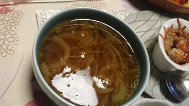 母の好きなスープ、今回は余っていた玉ねぎをじっくり炒めてオニオンスープに。