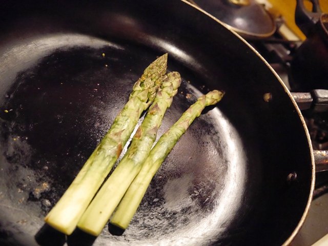 最後の3本、何にしようかと友人夫妻に相談。乾煎りしてみることにしました。あえて油も敷かず、塩も振らず、自らの水分を出しては熱せられ火が通っていくアスパラ達。