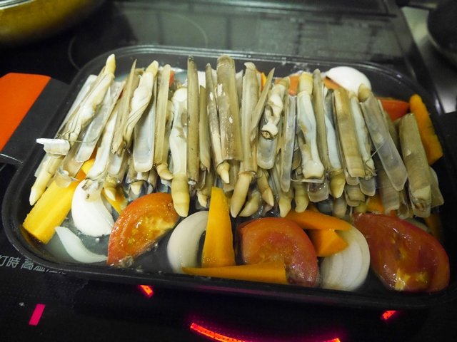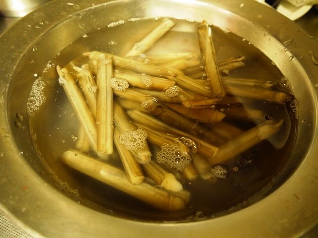 こちら、蒸しあがりです。貝の出汁だけで美味しい〜。見た目は少しホワイトアスパラっぽい??