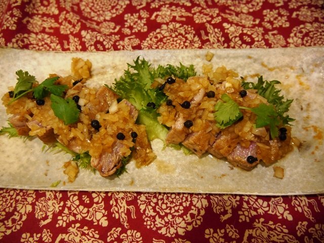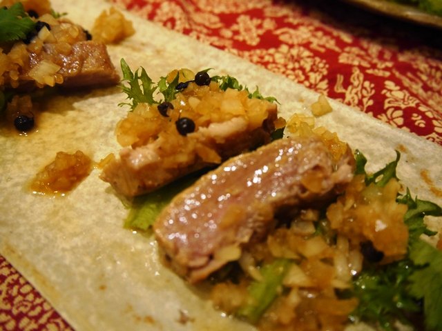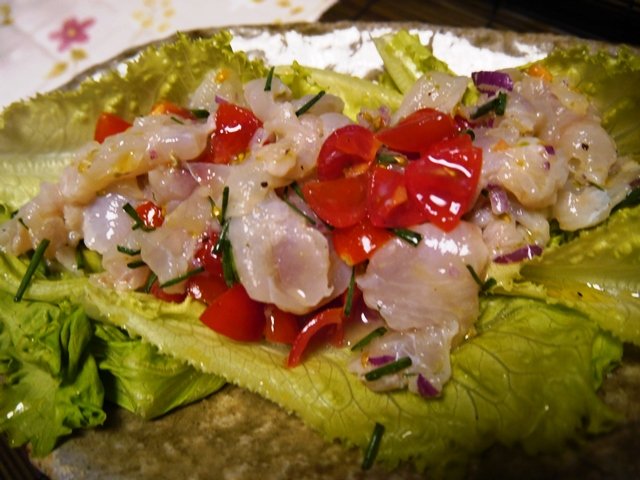 まずは鯛のセビーチェから。ちょっとワインビネガーで締めて、少しだけおろしにんにくで和えて、美味しいオリーブオイルをかけてあります。