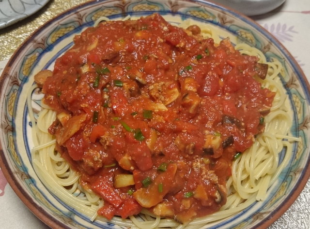 母のリクエストだったパスタは、松風入りのトマトソースにしました。ある種のミートソース、ですね。