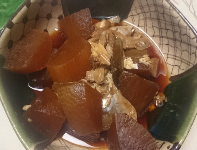 そしてカンパチのあらは鰤大根ならぬカンパチ大根に。大根にしっかり色が付いたけれど、色ほど塩辛くはありません。カンパチのあらもとろとろで美味しい〜。お酒飲みたいところだけど空港まで運転なので我慢。
