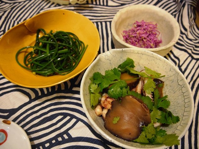 夕ご飯は、花ニラのお浸し、椎茸とゲソの煮もの、モッテ菊の酢の物、