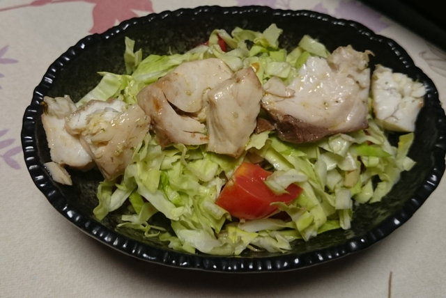 塩をしたカンパチの残りはオリーブオイルで煮て保存食にしました。さっそくその「保存食」のカンパチをキャベツのサラダの上に。