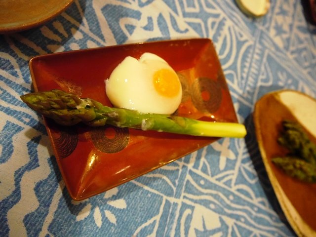 さっと茹でたアスパラ。作っておいた温泉卵を一人に一つ渡し、殻をわってチュルンと卵を出していただきます。黄身を箸の先でつつくと真っ黄色な液体がじゅわっと。そこにトリュフ塩をかけて、アスパラを付けて頂く。あーたまらない〜〜。