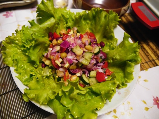 夜は急に作って、と言われて私料理。豆サラダでさっぱりと。