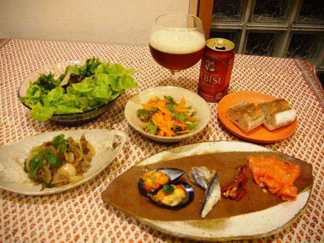 牛肉の薄切りと玉ねぎのガルム炒めや、ZABER'sのスモークサーモン、自家製秋刀魚の酢漬けなどを野菜と一緒にバゲットに挟んで食べようという趣向。お供はまたしてもビール。ワインが飲みたかったのですが一人であけるのもどうかなーと思って。