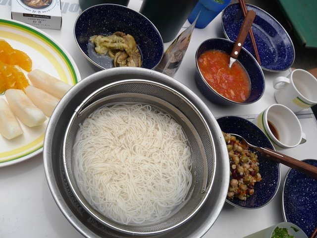 翌朝ご飯は持ってき忘れたガスパチョの代わりに前の晩に作ったガスパチョもどきでソーメン。