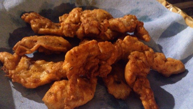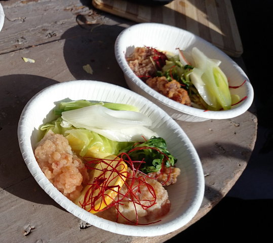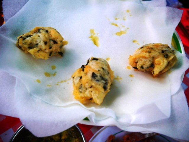 これ、なんとナマズのフリッターなんです!関西に転勤になってしまった築地師匠も久しぶりの参加。たくさんの天然鰻と共になまずも持ってきてくれました。なまずといえば、ケイジャン料理。粉に卵とビールを入れ、ケイジャン風のスパイスをミックスしていれたものにくぐらせて米油でこんがりと揚げてみました。まったく臭みがなくふわふわ!なまず食べるの初めてな人も多くてこれも大好評。 しかしなまずを釣ったり、それを綺麗に捌いたり!師匠、さすがです♪