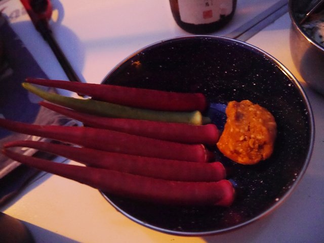 カラフルなオクラを、お友達の仕込んだ味噌ヌーボーで。
