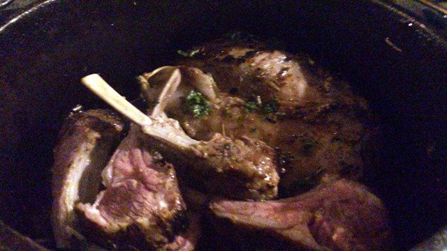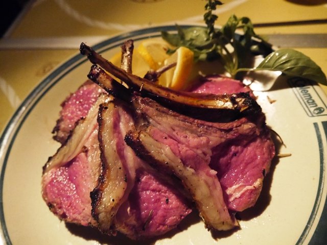 これはラムラック。ハーブたっぷりでマリネしたものを塊のままダッチオーブンで焼いていただき、少しおいてから切り分けたら素敵なピンク色に。