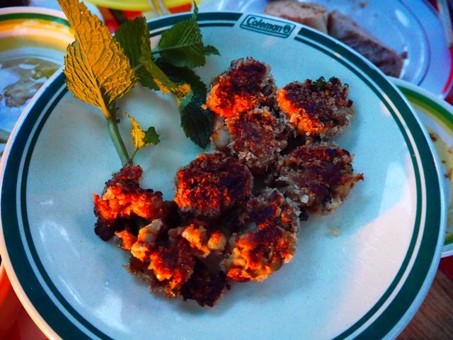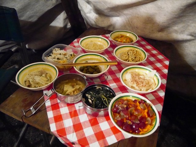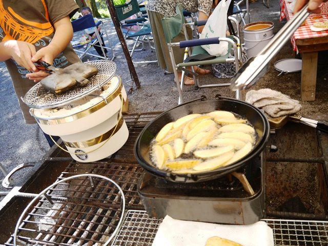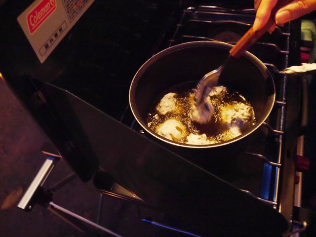 キャンプ夕飯後編です。だいぶ暗くなってきました。奥にはお友達の揚げたゼッポリーニが見えてます。