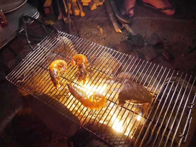 あっ、海老を持ってきてくださった方が炭火で焼いています。炭火焼の海老はそのままでも美味しいし、作ってもらったフレッシュトマトサルサやバジルペーストを付けても。